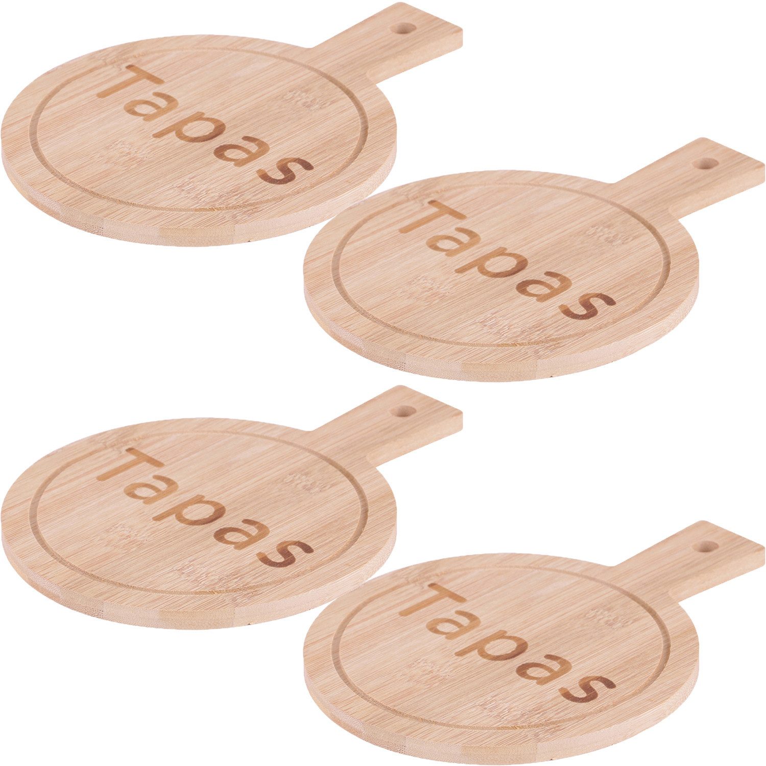 4er Set Tapas Brett Bako rund Bereichern Sie Ihre kulinarischen Erlebnisse mit unserem stilvollen Servierbrett aus hochwertigem Bambus. Mit einem ansprechenden Tapas-Motiv und einem praktischen Griff ist dieses Servierbrett die perfekte Ergänzung für Ihre Tapas-Abende und Snack-Präsentationen. Das großzügige Format von 19x14cm bietet ausreichend Platz für eine Vielzahl von Köstlichkeiten. Der integrierte Griff erleichtert das Tragen und Servieren, während die Aufhänge Möglichkeit für eine platzsparende Aufbewahrung sorgt. Unser Servierbrett ist nicht nur stilvoll, sondern auch umweltfreundlich, da es aus nachhaltigem Bambus in hellem Braun gefertigt ist. Bringen Sie spanisches Flair in Ihre Küche und Ihre Gäste werden von der Eleganz und Funktionalität dieses Servierbretts begeistert sein. Genießen Sie Tapas und Snacks auf eine ganz neue Art und Weise! • Größe: Ø = 19cm lang und 14cm breit • Farbe: Braun | Material: Bambus Holz | Lieferumfang: 4 Bretter