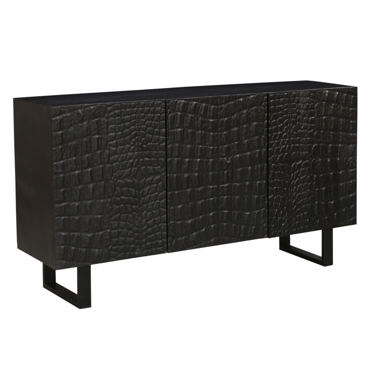 Das handgefertigte Sideboard "Adelgis" kombiniert warmes Massivholz mit einem schwarzen Metallrahmen, Die markante Lamellenfront verleiht diesem Möbelstück eine elegante Mid-Century-Ästhetik mit modernem Industrial-Charme,
