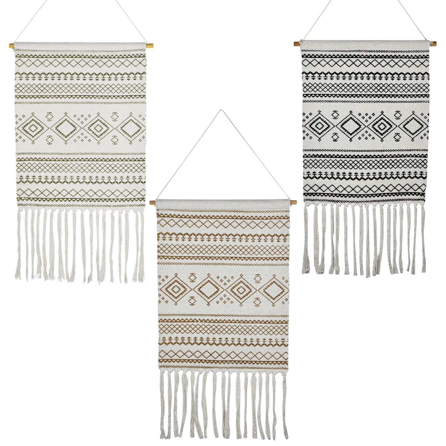 Bringen Sie Stil und Harmonie in Ihr Zuhause mit unserem 3er Set Wandbehang „Calegora“ im angesagten Boho-Stil! Die drei kunstvoll gewebten Wandteppiche (jeweils ca, 45x85cm) vereinen traditionelle Ethno-Muster mit modernen Farben wie Schwarz, Grau und Beige, Ideal für Wohnzimmer, Schlafzimmer, Flur oder Büro, überall dort, wo Sie ein stilvolles Statement setzen möchten,