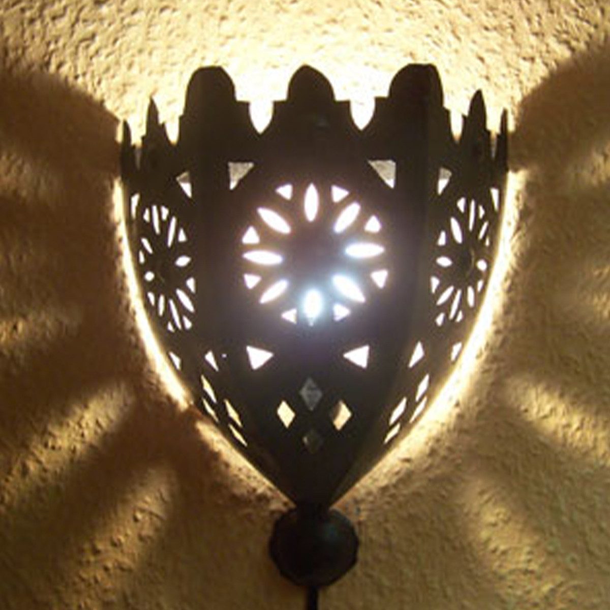 Bringen Sie orientalisches Flair in Ihr Zuhause mit der Wandleuchte Kamal. Aus robustem Metall gefertigt, erhält sie durch ein Säurebad eine edle Rostpatina und wird anschließend lackiert. Die fein perforierten Ornamente zaubern faszinierende Schattenspiele an Ihre Wände und schaffen eine warme, stimmungsvolle Atmosphäre.