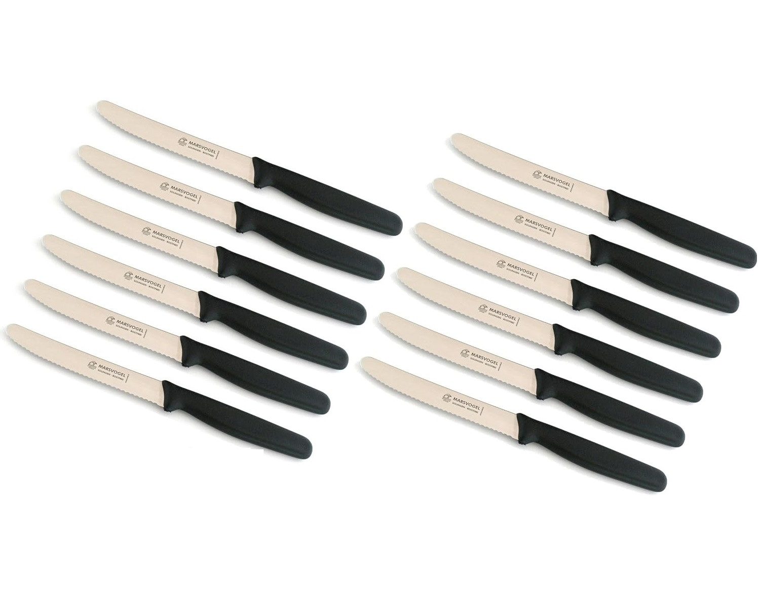 Setzen Sie mit diesem 12-teiligen Set an eleganten Tafelmessern von Marsvogel Solingen ein Statement auf Ihrem Esstisch. Mit ihren schlanken schwarzen PP-Griffen sind diese Menümesser sowohl für tägliche Mahlzeiten als auch für besondere Anlässe geeignet.