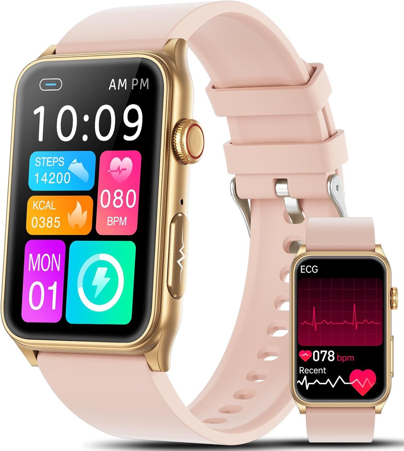 Mit der innovativen BLOCK-Funktion misst die Uhr EKG-Daten schmerzfrei ohne Blutentnahme. Zusätzlich erkennt sie Stressniveaus über HRV-Messung. Die Uhr überwacht wichtige Gesundheitswerte wie Herzfrequenz, Blutsauerstoff, Blutdruck, Körpertemperatur, Uratwerte und Schlafqualität. Für Frauen bietet sie eine umfassende Zykluserkennung mit Erinnerungen zu Menstruation, Eisprung und Schwangerschaft.