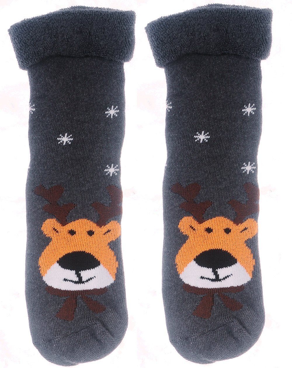 Tauchen Sie ein in die Gemütlichkeit unserer warmen, weichen Frottee-Socken mit entzückendem Rentiermotiv - die perfekte Begleitung für kuschelige Stunden zuhause, als Schlafsocken oder für Unternehmungen unterwegs. In einer verschneiten Winterlandschaft, wo die Luft nach Tannennadeln duftet und die Sterne am Himmel funkeln, wurden unsere Thermosocken mit einem zauberhaften Rentiermotiv geboren. Diese Socken sind mehr als nur ein Kleidungsstück; sie sind der Schlüssel zu wohliger Wärme und stilvollem Komfort. Mit ihrer hochwertigen Frottee-Oberfläche schmiegen sich die Socken sanft an Ihre Füße, verwöhnen sie mit einem flauschigen Gefühl und halten sie dabei angenehm warm. Perfekt geeignet für gemütliche Abende zuhause, umhüllen sie Ihre Füße in eine sanfte Umarmung, die den Alltagsstress vergessen lässt. Aber das ist noch nicht alles – unsere Thermosocken sind auch die idealen Begleiter für unterwegs. Egal ob Sie durch knirschenden Schnee spazieren oder winterliche Abenteuer erleben, Ihre Füße bleiben stets warm und geborgen. Die Socken mit dem bezaubernden Rentiermotiv sind nicht nur ein modisches Accessoire, sondern auch ein herzerwärmendes Geschenk für Ihre Lieben. Perfekt zum Verschenken zu Weihnachten oder zum Nikolaustag, verbreiten sie nicht nur Wärme, sondern auch festliche Freude. Entdecken Sie den Zauber der Winterzeit mit unseren warmen Frottee-Socken. Lassen Sie sich von der Magie des Rentiermotivs verzaubern und schenken Sie Ihren Füßen das Geschenk der Gemütlichkeit. Denn in jeder Geschichte steckt ein wohltuendes Kapitel – und dieses beginnt mit unseren einzigartigen Thermosocken. Material: 80% Baumwolle, 15% Polyamid, 5% Elasthan