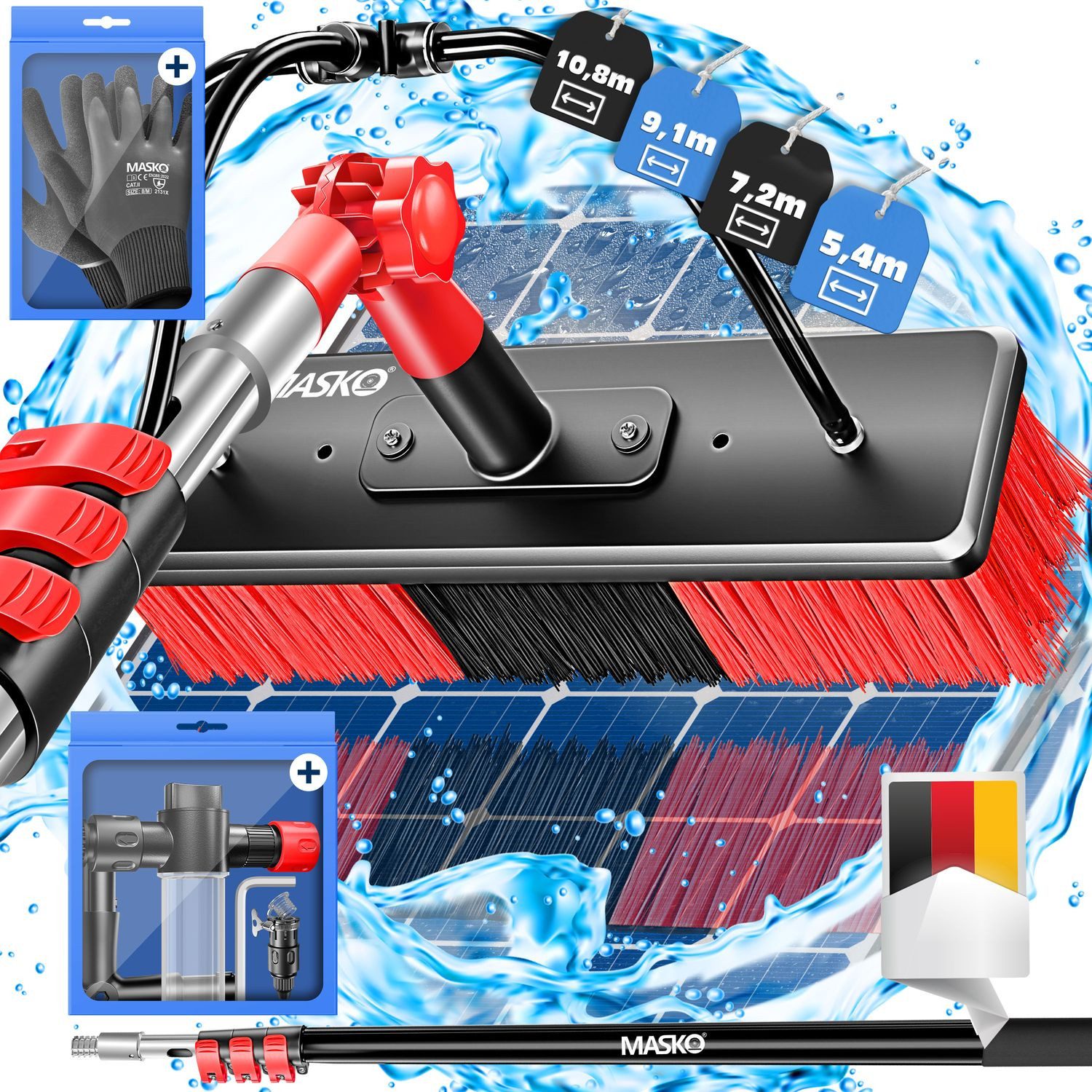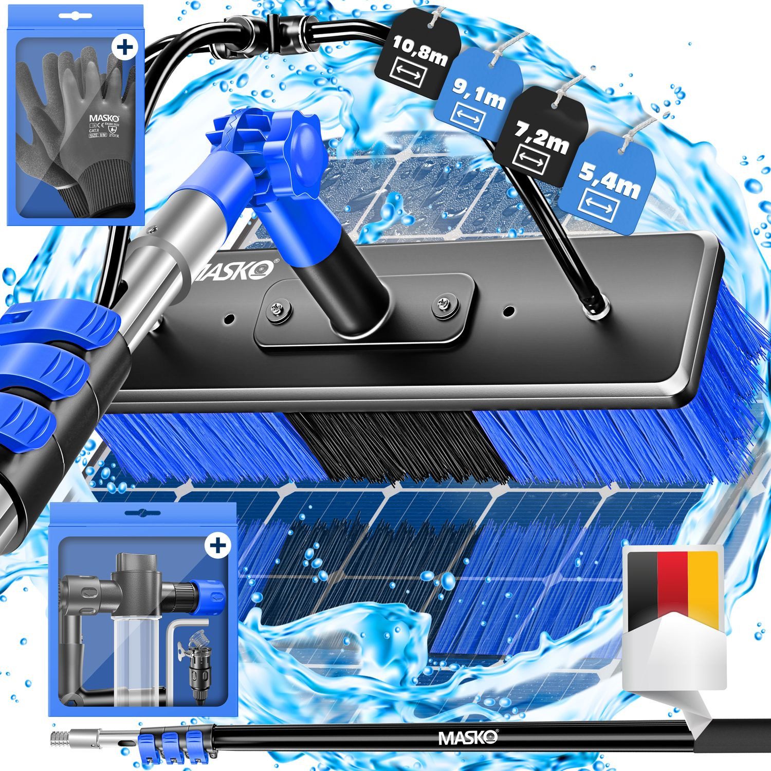 MASKO® Teleskop Waschbürste – Ausziehbarer Teleskopstiel für Fenster, Wintergärten & Solaranlagen, mit Wasseranschluss, inkl. Handschuhe & Seifenspender