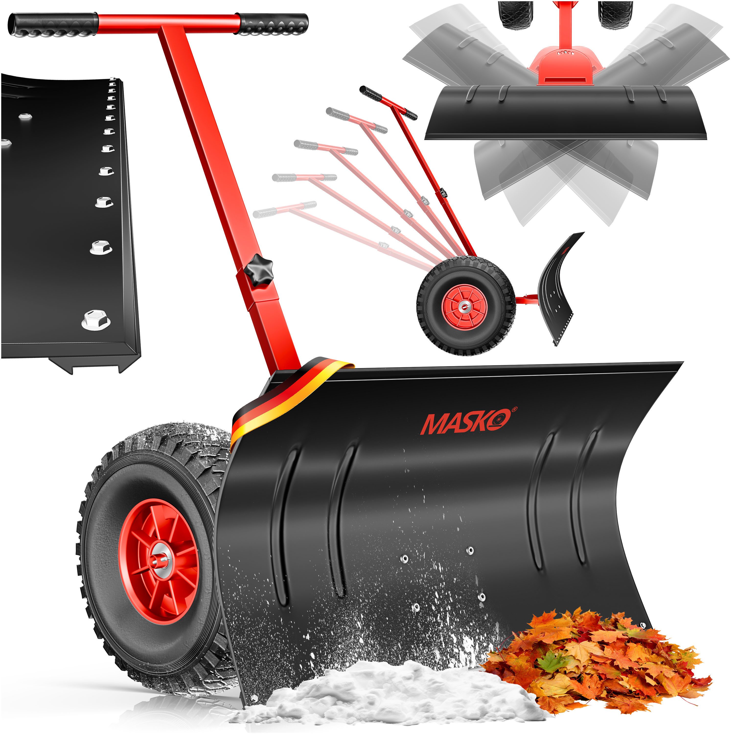 MASKO Schneeschieber auf Rädern und 5-Fach im Winkel verstellbar, Handgriff in der Höhe verstellbar, großflächige Kunststoffscheuerleiste, zusammenklappbar