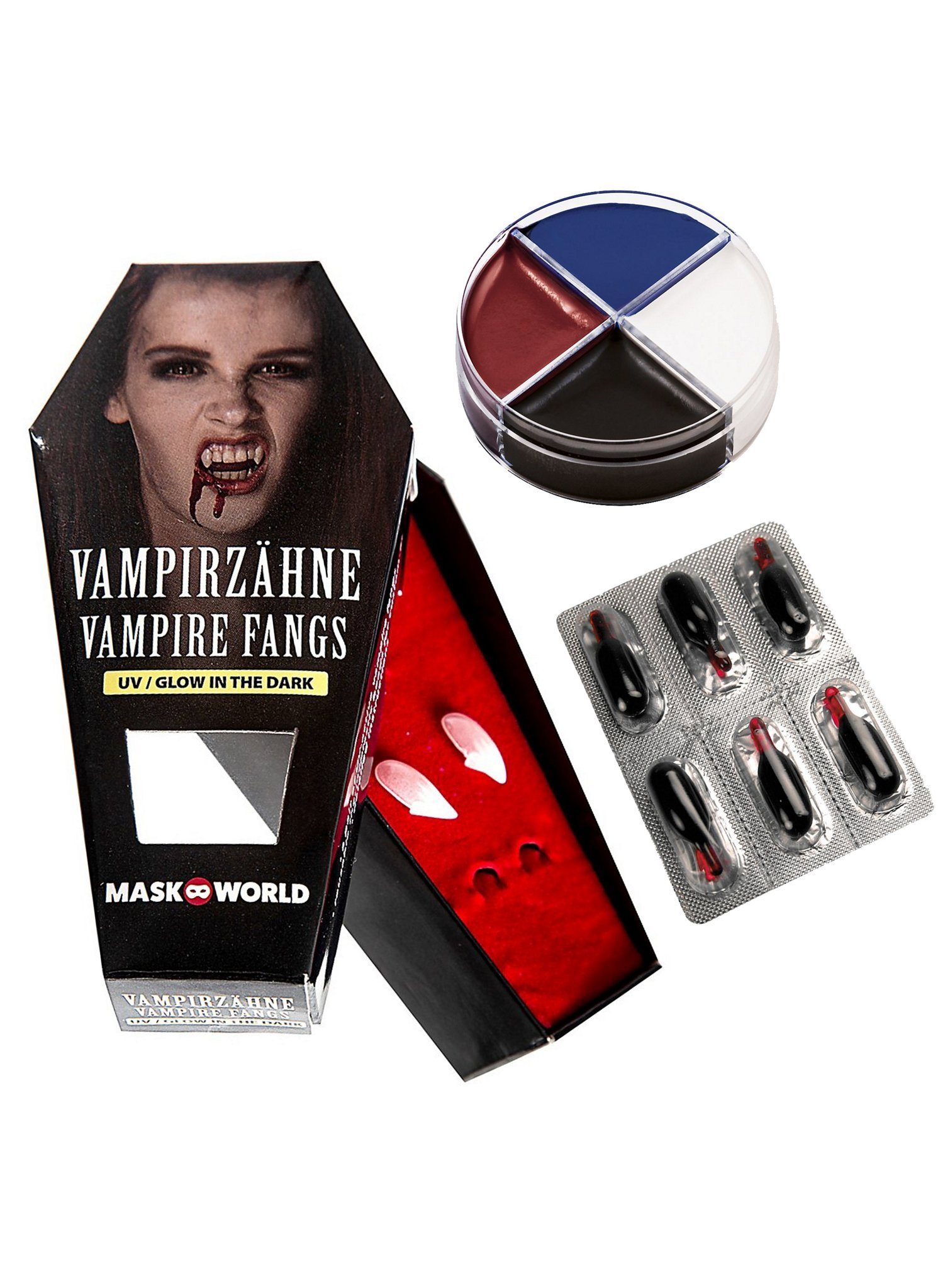 Ausstattung | - Vampir-Set Vlad mehrteilig- mit zwei leuchtenden Vampirzähnen (Glow in the Dark)- mit Haftperlen zur Befestigung- mit sechs Blutkapseln- mit Schminkdose mit vier Farben (15 ml) |