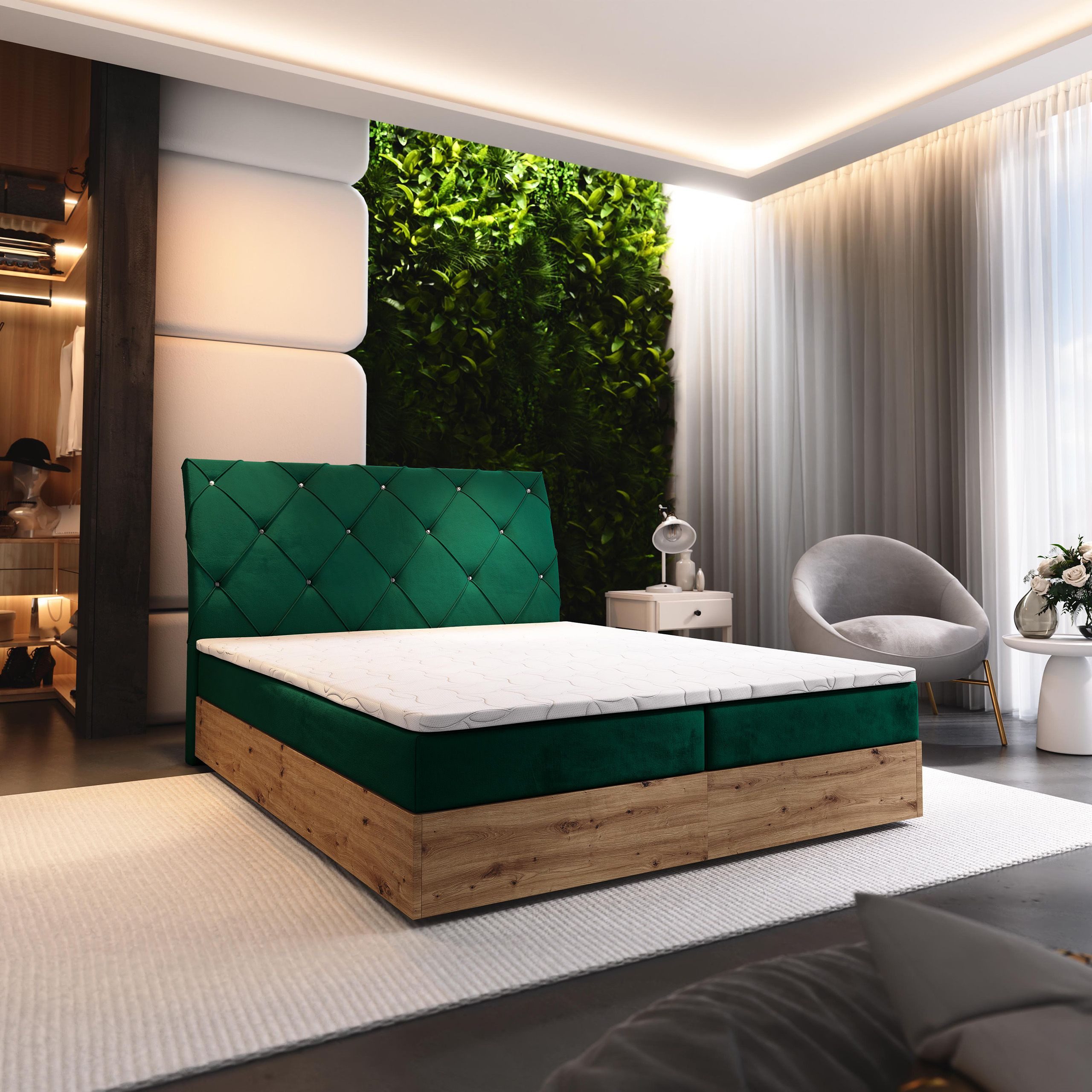 Der geräumige Bettkasten mit hohem Fassungsvermögen bietet genügend Platz für Bettdecken, Kissen oder andere Textilien. Er sorgt für Ordnung im Schlafzimmer und hält Ihre Schlafutensilien stets griffbereit. Der benutzerfreundliche Mechanismus erleichtert den Zugriff auf die verstauten Gegenstände und macht die Organisation zum Kinderspiel.