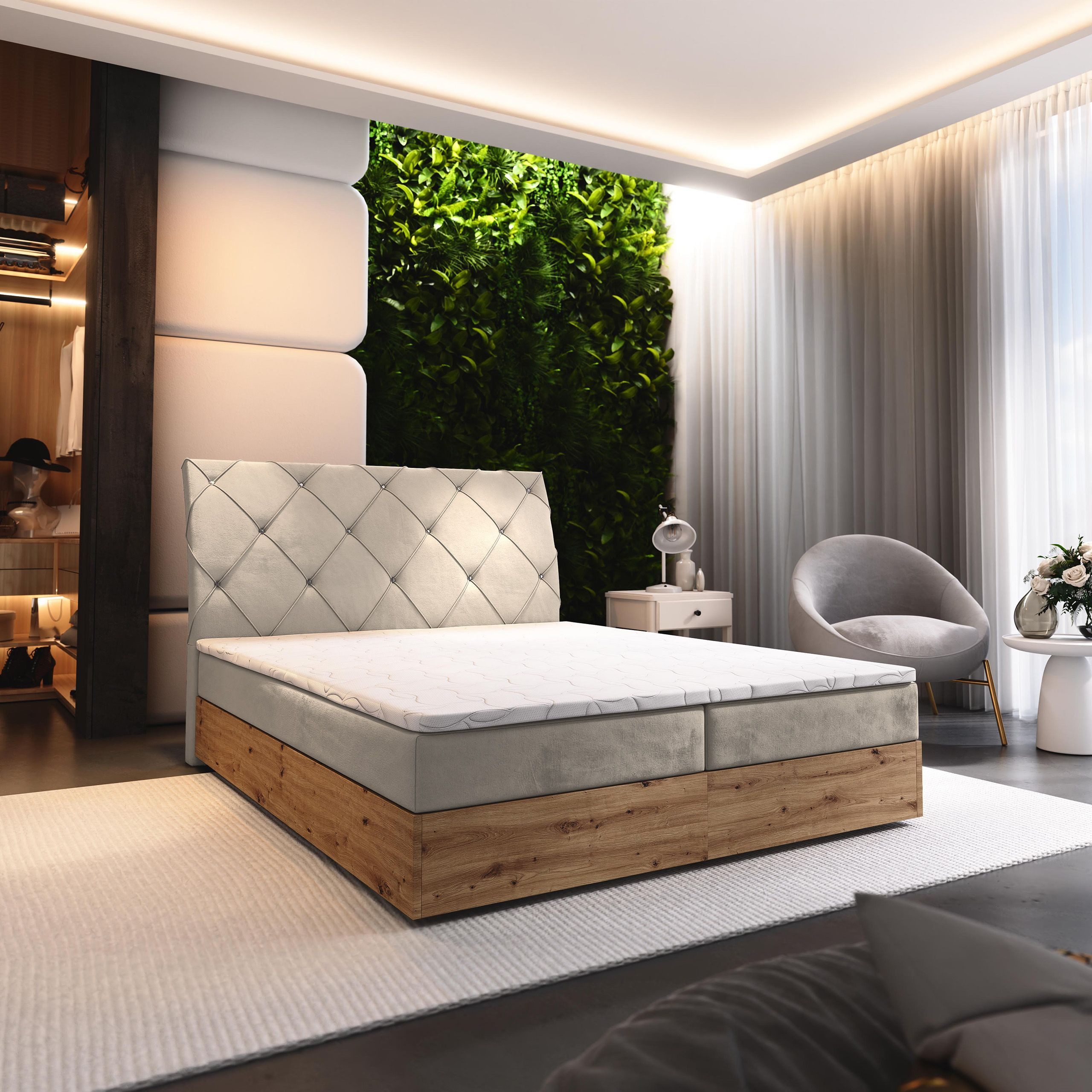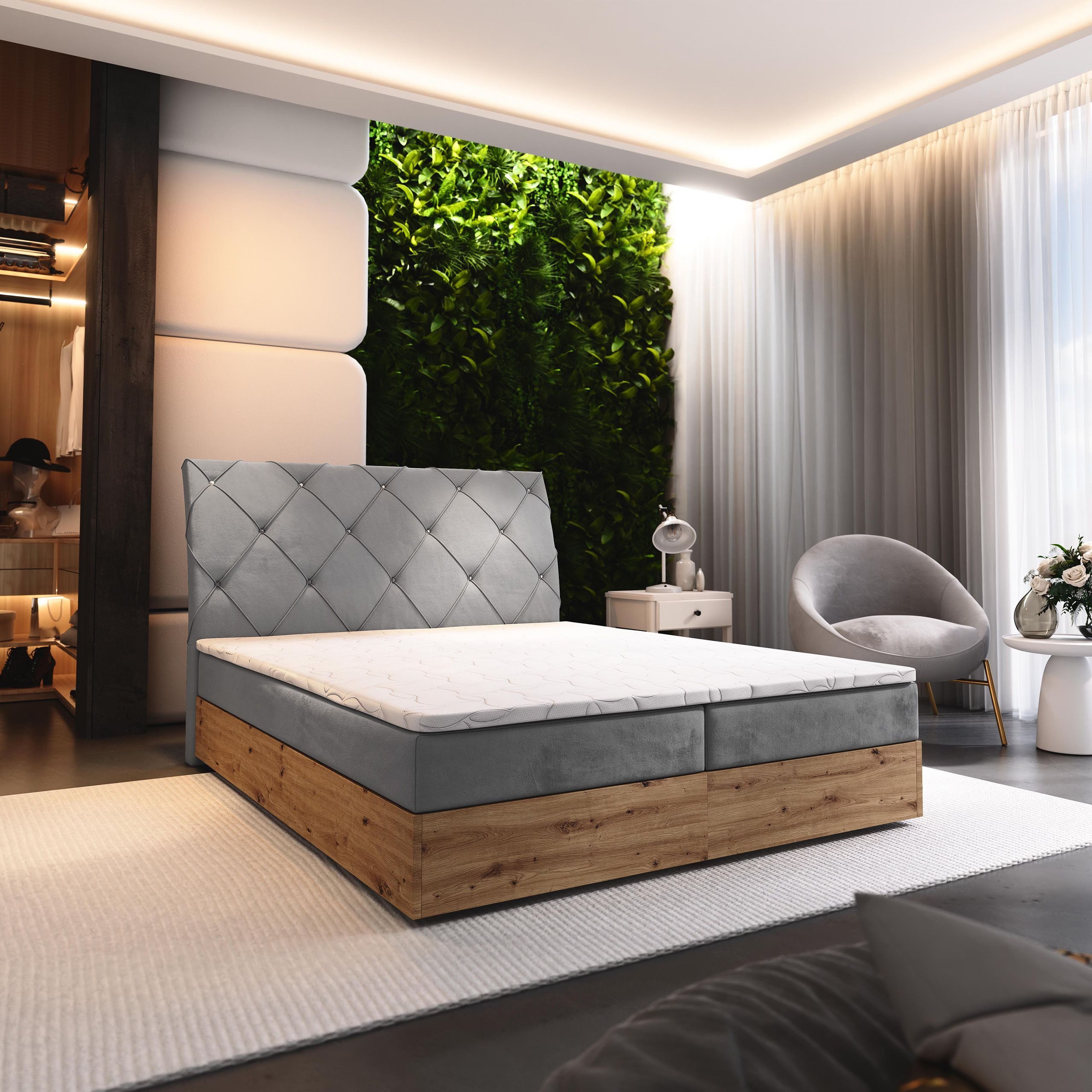 Das Kontinentalbett VELLANO vereint Stil, Funktionalität und ergonomischen Komfort in einem einzigartigen Design. Durch die harmonische Verbindung von Ästhetik und praktischen Eigenschaften wird dieses Bett zum Blickfang in jedem Schlafzimmer und sorgt für eine einladende Atmosphäre voller Eleganz.