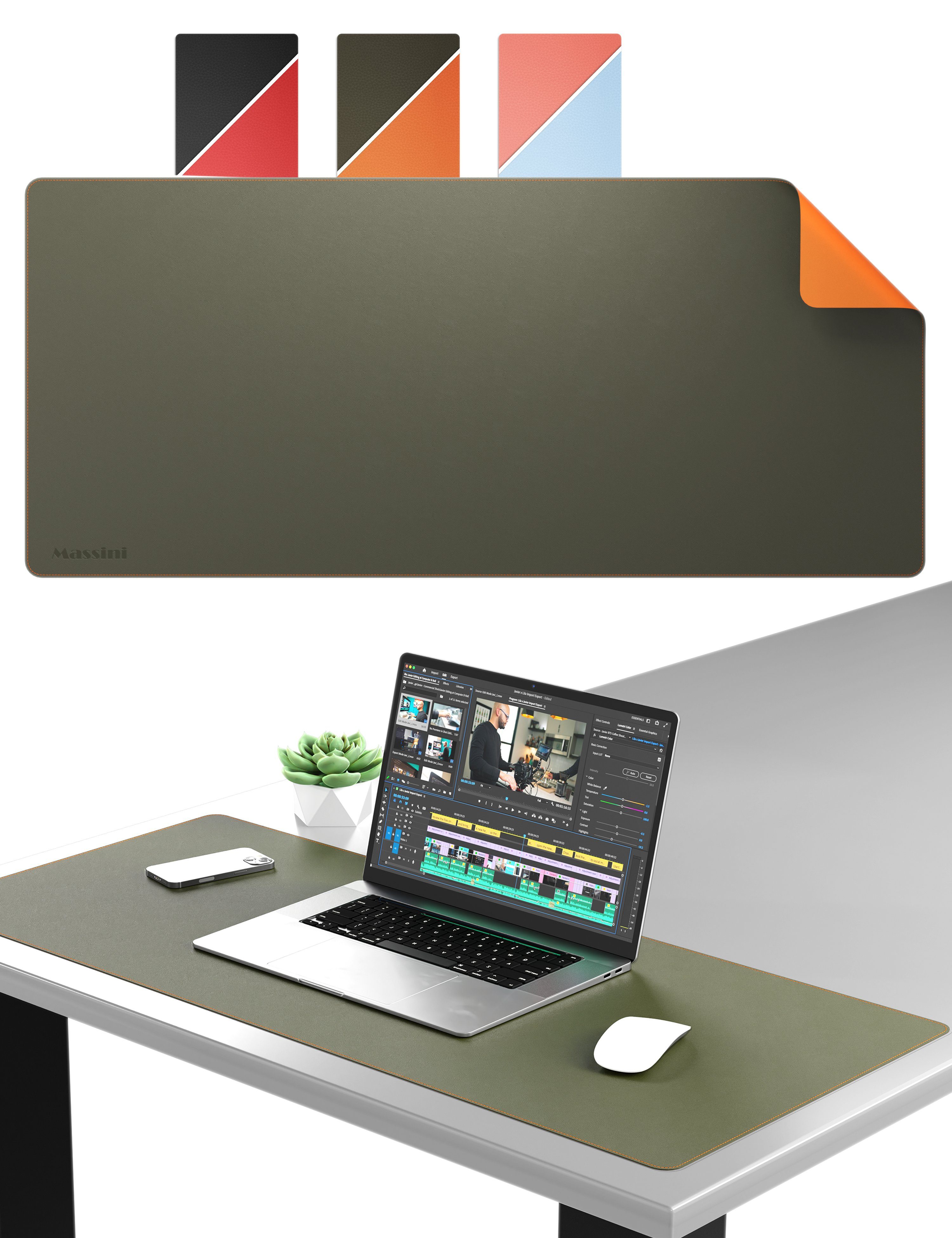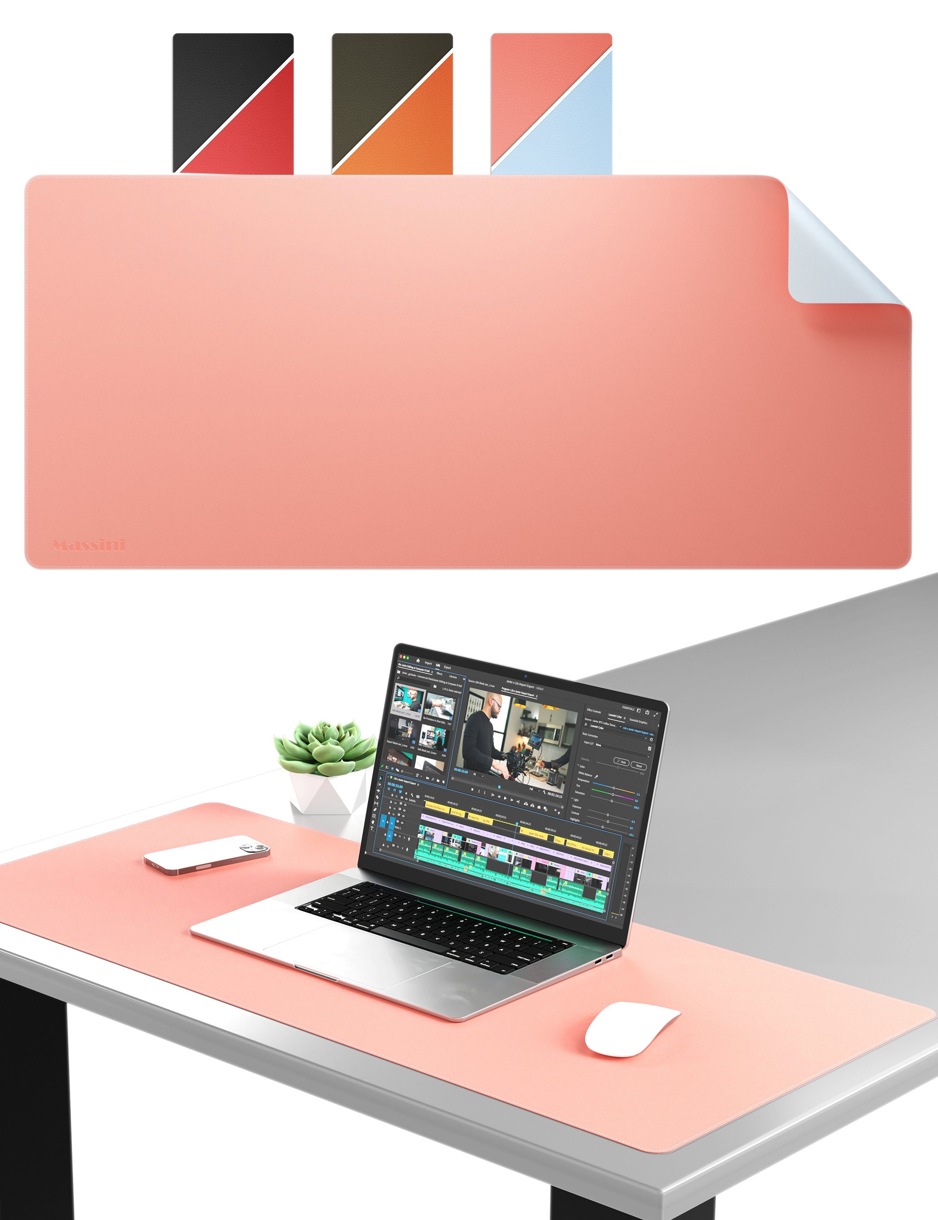 Entdecke das MASSINI Mauspad XXL: Die perfekte Schreibtischunterlage aus Kunstleder, die dein Arbeits- oder Gaming-Erlebnis auf ein neues Level bringt. Mit den optimierten Eigenschaften dieses Mauspads gleitet deine Maus perfekt und präzise über die gesamte Fläche. Dieses Mauspad mit den Abmessungen von 90 x 40 cm bietet ausreichend Platz für deine Tastatur und Maus und schafft eine angenehme Arbeitsumgebung. Ein besonderes Highlight des MASSINI Mauspads ist seine Doppelseitigkeit. Du kannst zwischen verschiedenen Farben wählen, um das Mauspad an deine individuellen Vorlieben anzupassen. Wechsle je nach Stimmung oder Arbeitsumgebung die Seite und entdecke immer wieder neue Möglichkeiten. Die hochwertige Verarbeitung und das ansprechende Design tragen zu seiner Identität und seinem hohen Wiedererkennungswert bei. Egal, ob du es im Büro, im Homeoffice oder beim Gaming verwendest, dieses vielseitige Mauspad ist die ideale Lösung für jede Herausforderung. Es bietet eine rutschfeste Unterseite, die für einen stabilen Halt auf deinem Schreibtisch sorgt, während du dich auf deine Aufgaben konzentrierst oder in die Welt des Gamings eintauchst. Mit diesem Mauspad erreichst du mühelos das nächste Level. Neben den funktionalen Eigenschaften bietet das MASSINI Mauspad XXL auch eine großzügige Geld-zurück-Garantie von 60 Tagen. Wir sind so überzeugt von der Qualität und Leistungsfähigkeit dieses Produkts, dass wir dir versprechen, dein Geld zurückzuerstatten, falls du aus irgendeinem Grund nicht zufrieden sein solltest. Deine Zufriedenheit steht für uns an erster Stelle. Erlebe Komfort, Stil und Funktionalität in einem Produkt - das MASSINI Mauspad XXL. Hol es dir noch heute und revolutioniere deine Arbeits- oder Gaming-Erfahrung.