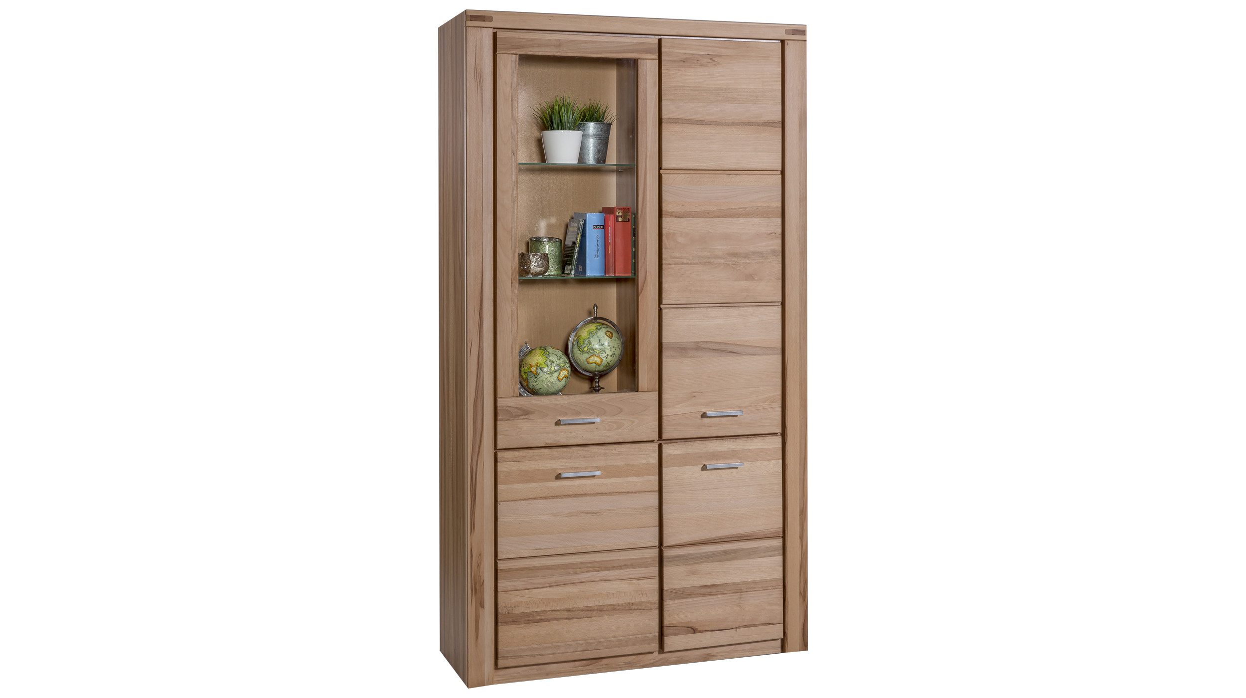 Natürliche Gemütlichkeit - Diese Vitrine verbindet natürliche Materialien mit stilvollem Design und schafft eine einladende Atmosphäre in Ihrem Zuhause. Die geölte Front aus massivem Kernbucheholz hebt die einzigartige Maserung hervor und unterstreicht den charmanten Charakter des Holzes. Der Korpus aus authentischer Kernbuche-Nachbildung harmoniert perfekt mit der Front und fügt sich mühelos in verschiedenste Einrichtungsstile ein. Metallgriffe in Edelstahloptik setzen dezente, moderne Akzente und vervollständigen das Design. Bringen Sie mit diesem Möbelstück natürliche Wärme und Eleganz in Ihre Wohnräume.