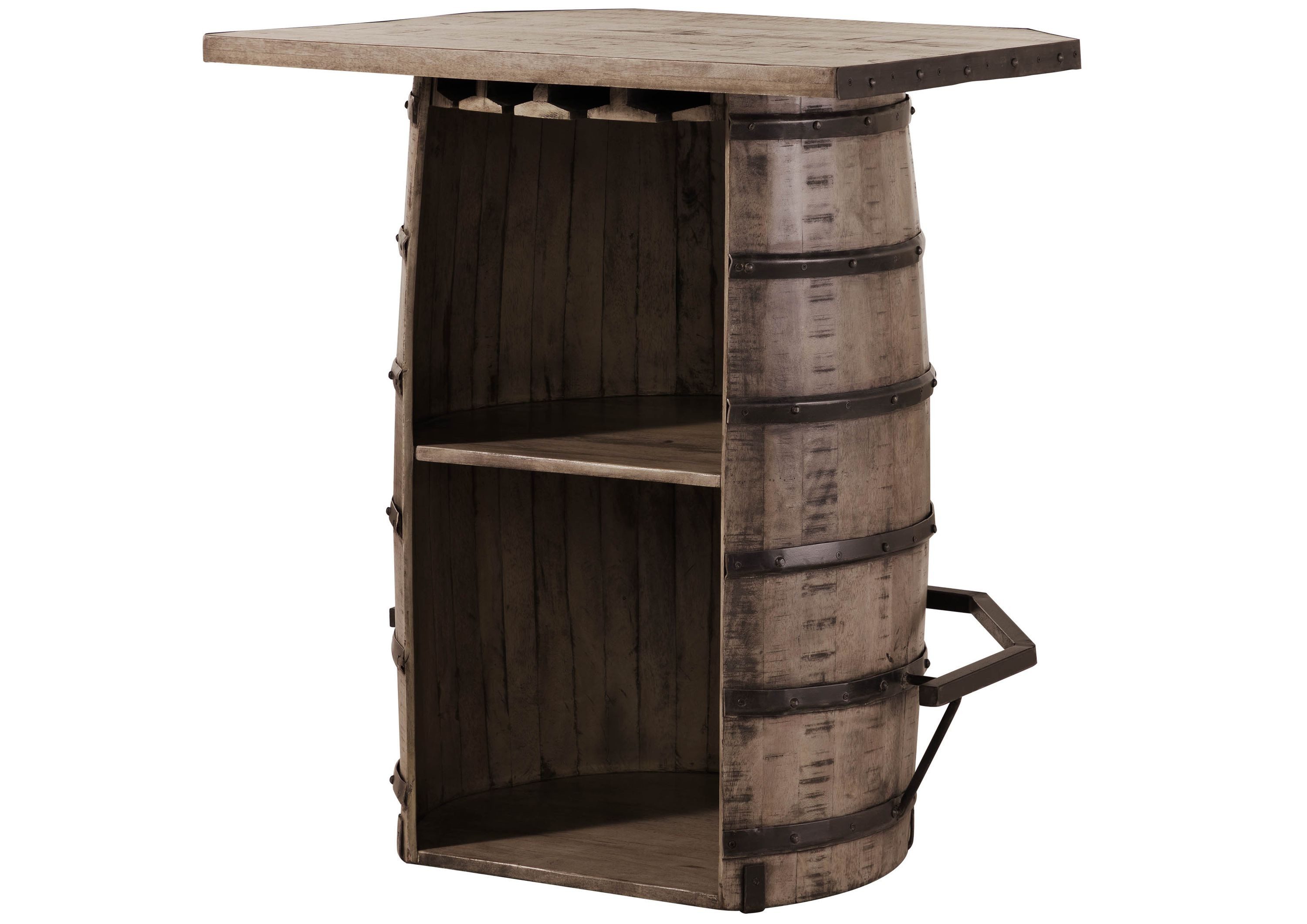 Einen ungewöhnlichen Look verleiht der Tischplatte zudem ihre sechseckige Form. Diesem Design folgt die Fußstütze, die am geschlossenen Teil des Fasstischs angebracht wurde. Beim Blick auf den hinteren Teil des Möbelstücks offenbart sich dessen Highlight: Das Innere dient als Stauraum mit Platz für Getränke, Gläser und mehr auf zwei Ebenen. Sogar ein praktischer Gläserhalter findet sich im oberen Bereich. So lässt sich der Feierabend ausklingen!
