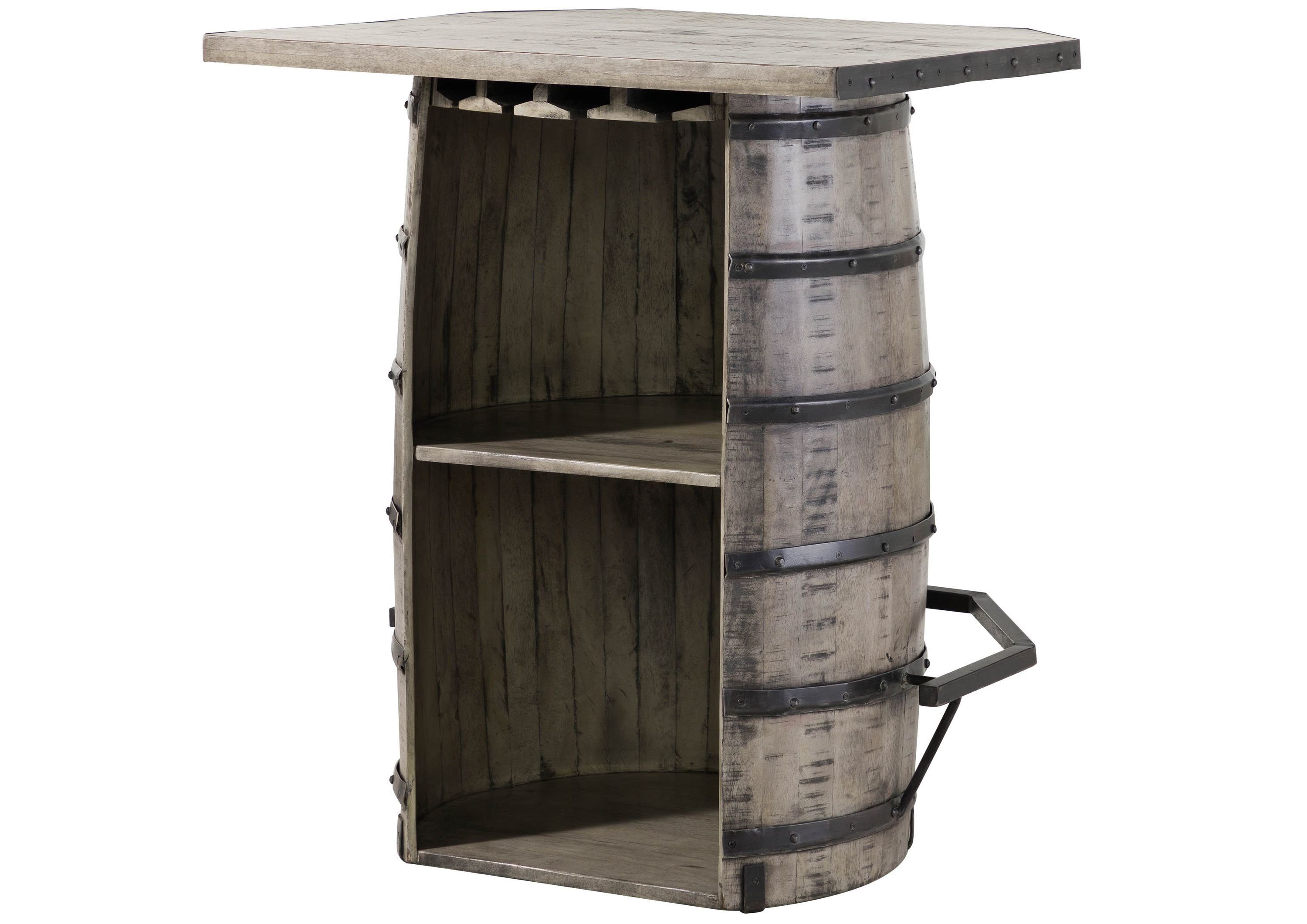 Dieser außergewöhnliche Tisch verleiht der hauseigenen Bar einen unverkennbaren Look. Gefertigt aus massivem Mango-Holz, macht der Fasstisch der Wohnserie HEAVY INDUSTRY diesem Namen alle Ehre: Grobe Metallbänder mit geschwärzter Oberfläche und Nieten halten die grau lackierten Holzbohlen zusammen. Auch den Rand der Tischplatte umläuft ein solches Metallelement.