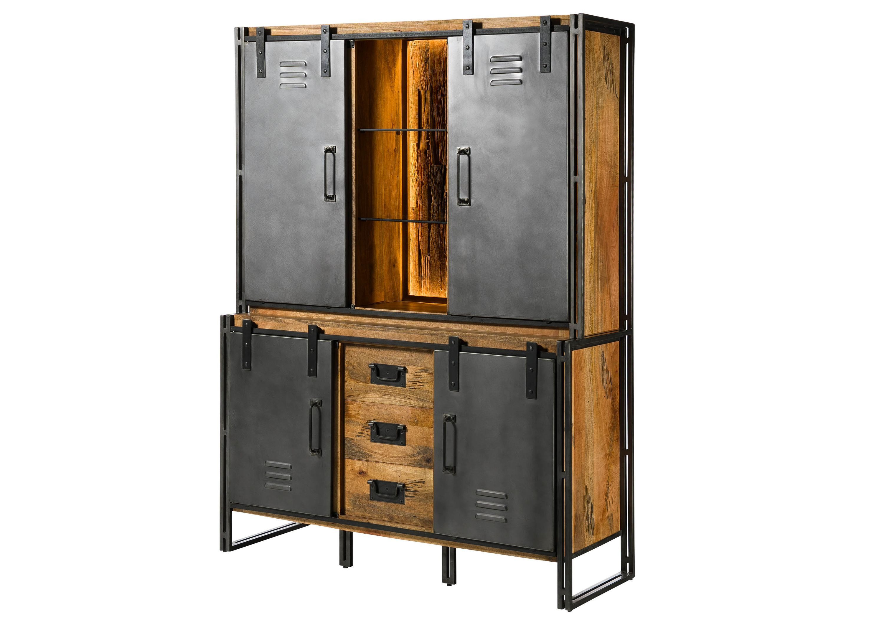Dieses Buffet mit Vitrinen-Element verbindet Industrial-Details mit modernen LEDs. So strahlt die Beleuchtung auf eine grob strukturierte Rückwand aus Altholz und lässt ein einzigartiges Spiel aus Licht und Schatten entstehen. Haptische Raffinessen finden sich auch auf dem massiven Mangoholz-Korpus, der sich mit Hobelschlägen im Used Look präsentiert. Für das industrielle Flair sorgen Schiebetüren in Spind-Optik, klappbare Bügelgriffe und sichtbare Schrauben – einheitlich aus grauem Metall gefertigt.