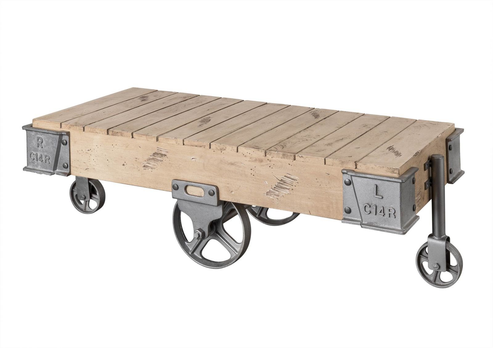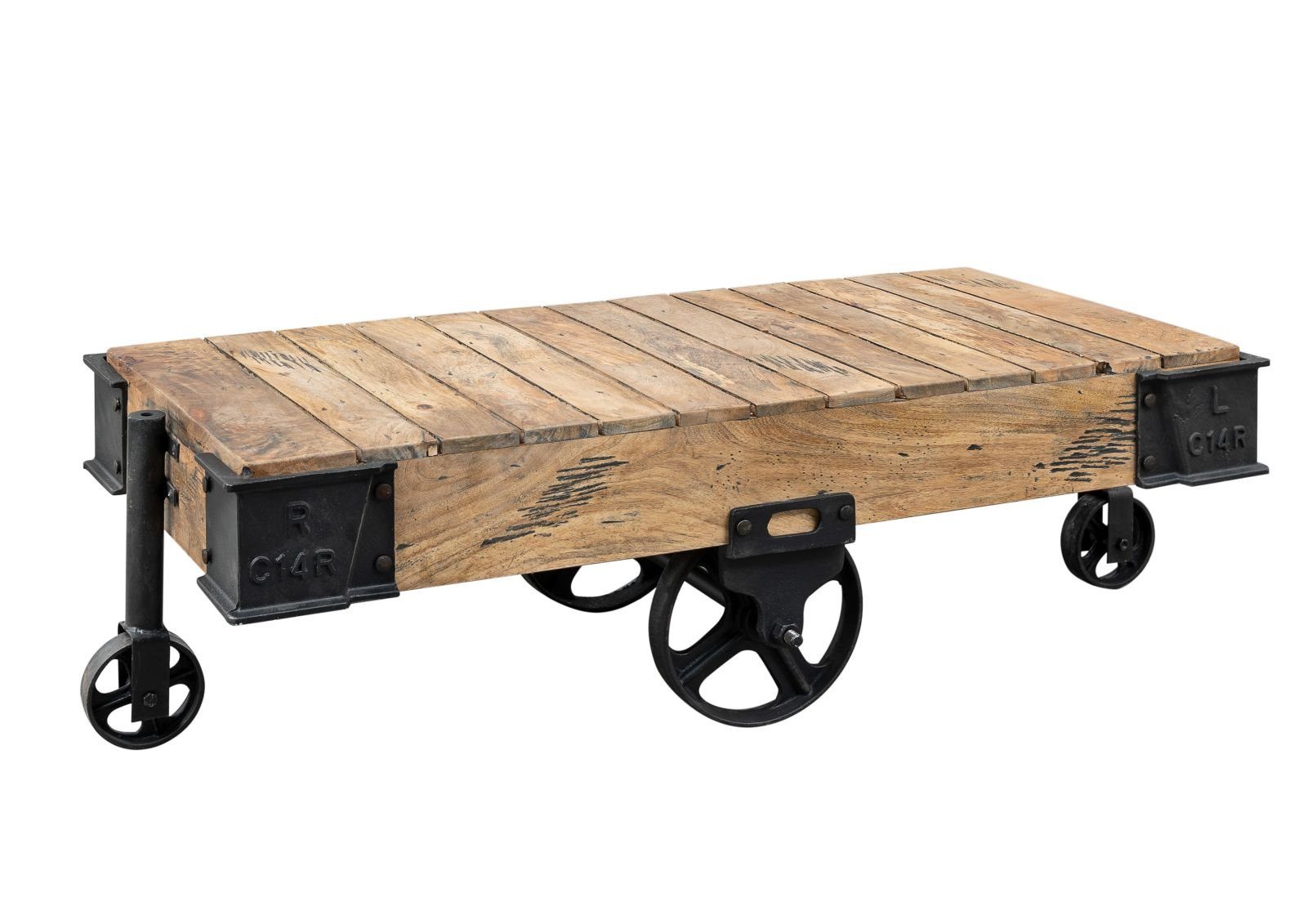 Wohnzimmertisch mit Rollen: Industriedesign der Extraklasse Dieser Couchtisch der RAILWAY Serie zieht alle Blicke auf sich. Denn das massive Möbelstück aus Mangoholz erinnert mit seiner einzigartigen Optik an eine Lore aus dem Eisenbahnwesen. Statt klassischen Tischbeinen halten den Wohnzimmertisch vier dunkle Rollen aus Eisen. Auch weitere Metall-Applikationen sind am Couchtisch angebracht und sorgen für einen industriellen Touch des Möbels. Gefertigt ist der Wohnzimmertisch im Industriedesign aus massivem Mangoholz. Besonders die Struktur und die Oberfläche dieses Werkstoffes machen das Möbelstück zu etwas ganz Besonderem: so zeigt sich die einzigartige Maserung unter der Lackierung des Holzes.