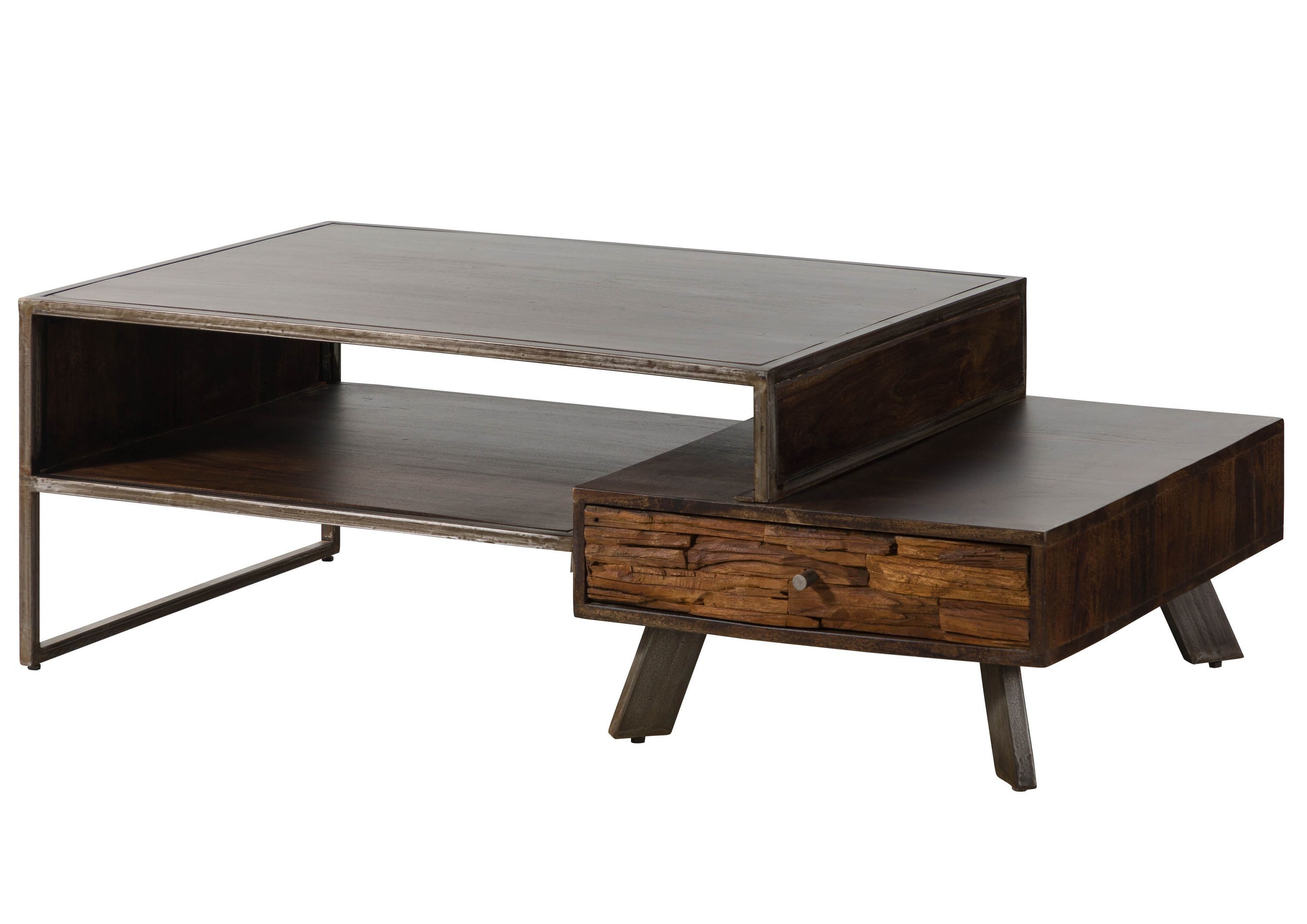 Ein stilvoller Mix aus groben Strukturen und glatten Oberflächen: Dieser dunkelbraune Couchtisch aus Altholz und Akazie zeigt sich im modernen Used-Look. Besonderer Hingucker ist die Schubladen-Front aus Altholz, deren Relief dem Tisch eine rustikale Note verleiht. Optisch scheint das Schubfach in die Tischplatte mit darunterliegender Ablage überzugehen. So ergibt sich eine asymmetrische Silhouette, die das Möbelstück zu etwas Besonderem macht.