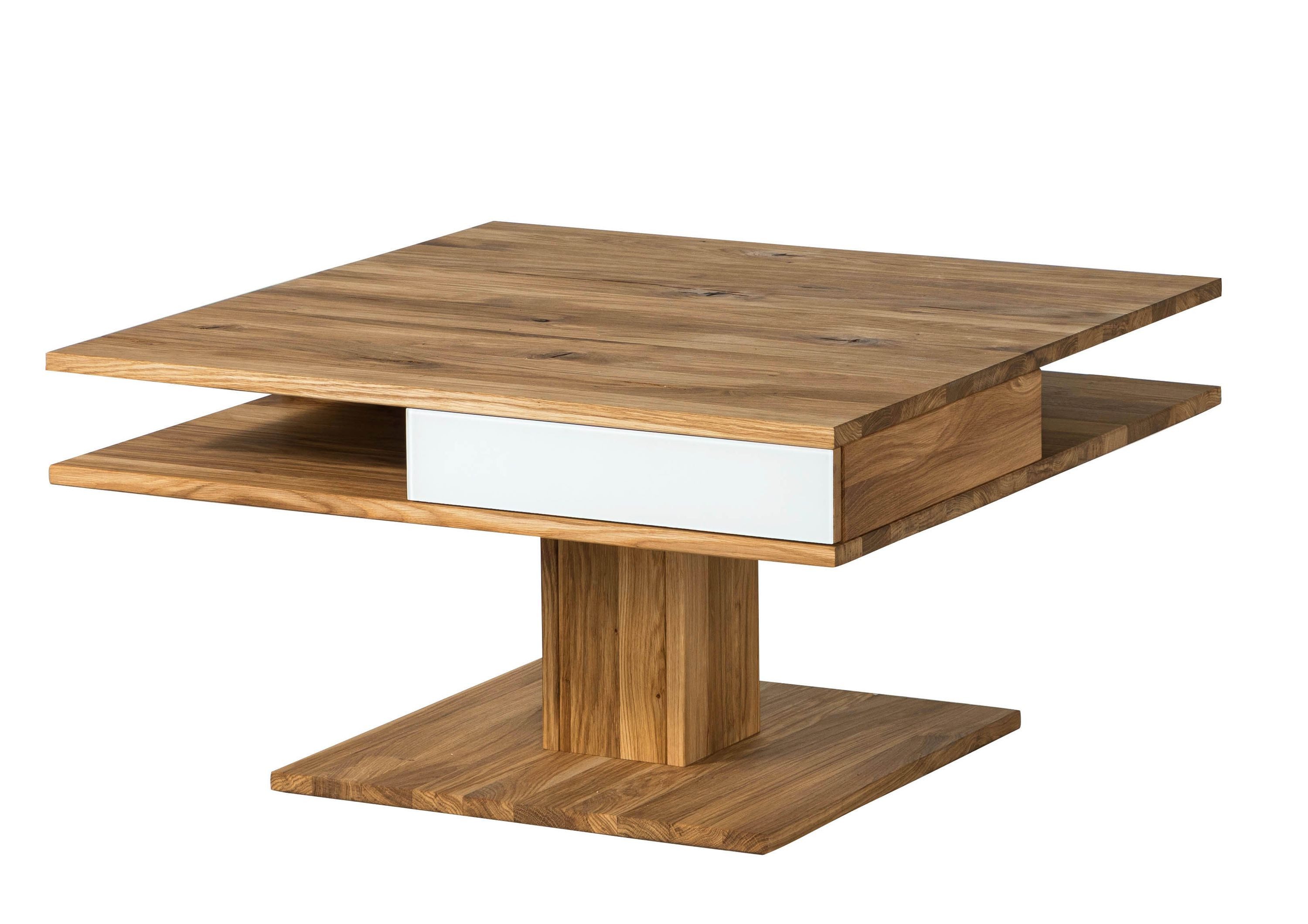 Ein Statement-Möbel für das Wohnzimmer: Dieser Couchtisch stellt das Holz der Wildeiche gekonnt in den Fokus. Zart geölte Oberflächen zeigen die lebendige Maserung des Naturmaterials, die sich bis über den Standfuß zieht. Dazu kommen praktische Annehmlichkeiten wie zwei Schubladen mit Push-to-Open-Mechanik. So gelingt das Öffnen ganz leicht per sanftem Druck auf die Front. Für ein lautloses Спрятать sorgt die Soft-Close-Technologie.