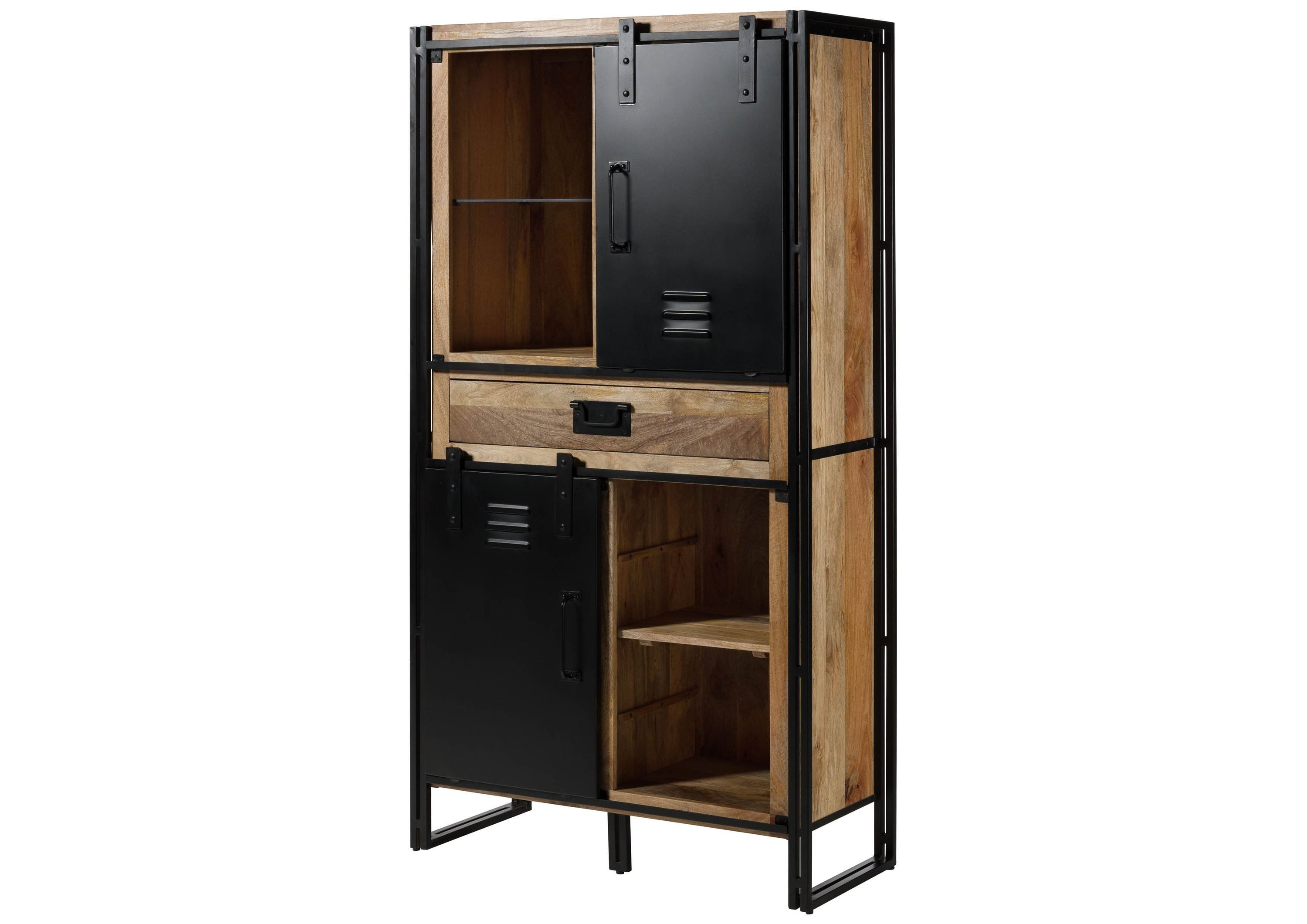 Dieser Industrial-Wohnzimmerschrank mit Schiebetüren in Spindschrank-Optik interpretiert den industriellen Wohnstil neu: Hochwertiges Mango-Massivholz trifft auf schwarzes Metall mit dezenten Details. So äußert sich der typisch fabrikhafte Charakter lediglich durch Lüftungsschlitze in den Türfronten, die an einen Spind erinnern, sowie deren sichtbar angebrachte Rollschienen. Glaseinlegeböden im oberen Schrankbereich, die edle Holzoberfläche und die breite Schubladenfront stehen für den besonderen Charakter dieses Möbelstücks ein.