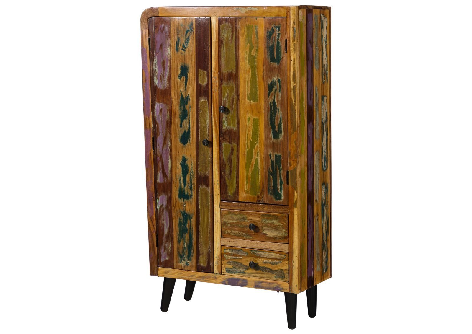 Ein stylisches Einzelstück ist dieses Highboard aus massivem Altholz. Aufregende Farbrückstände und eine abgerundete Ecke verleihen dem Schrank eine ungewöhnliche und spannende Form. Zusammen mit Eisendetails wird das Holzprodukt zum Möbelstück im Vintagestil. Entdecken Sie weitere Möbel der Serie SIXTIES in unserem Shop.