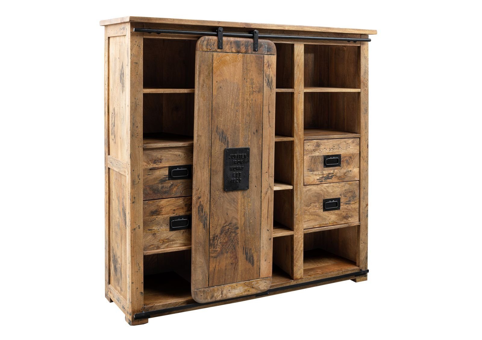 Die Schiebetür selbst lässt sich an einer frontal montierten Eisenstange verschieben. So wird wahlweise je eines der drei Elemente des Highboards verdeckt. Ein echter Clou des Möbels, denn so entsteht je nach Position der Schiebetür eine vollkommen andere Optik. Im Inneren des Massivmöbels befinden sich elf Fächer und vier Schubladen, die Stauraum schaffen und das Highboard damit ideal für jedes Wohnzimmer machen.
