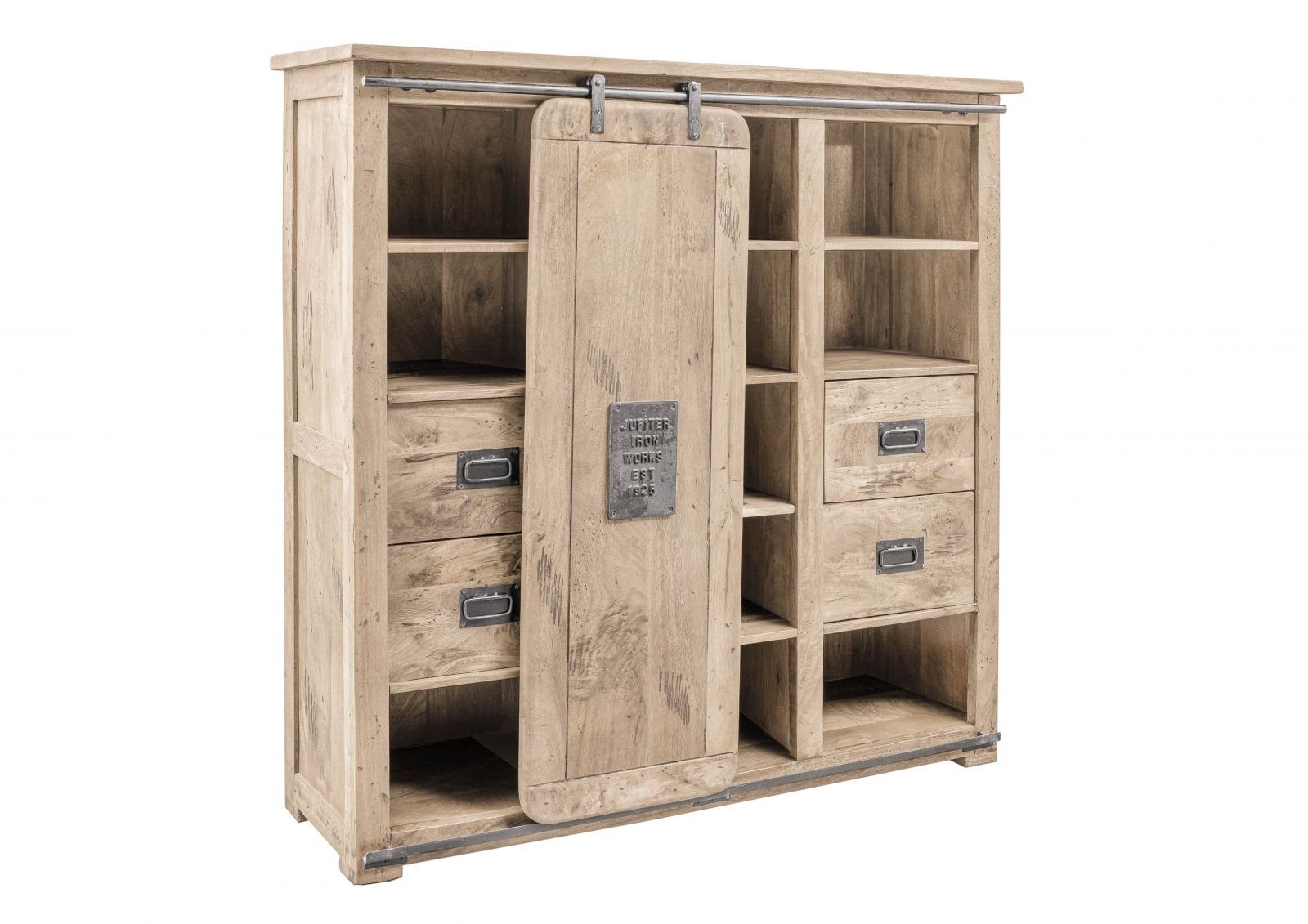 Dieses Highboard im Industrial Style ist aus massivem Mangoholz gefertigt “ ein wirklich einzigartiger Rohstoff. Unter der braunen Lackierung des Schrankmöbels zeigt sich die individuelle Maserung des Holzes. Gekonnt ergänzt wird der industrielle Touch durch Eisen-Elemente an der Front des Möbels: schicke Metall-Beschläge zieren die beiden Schubladen und die Schiebetür.