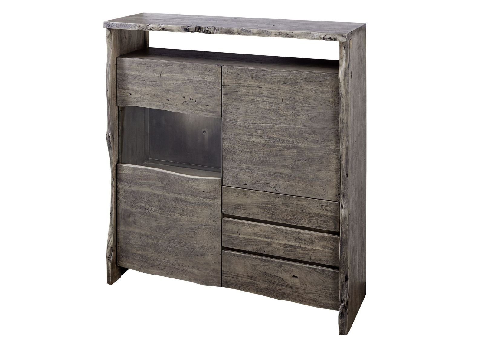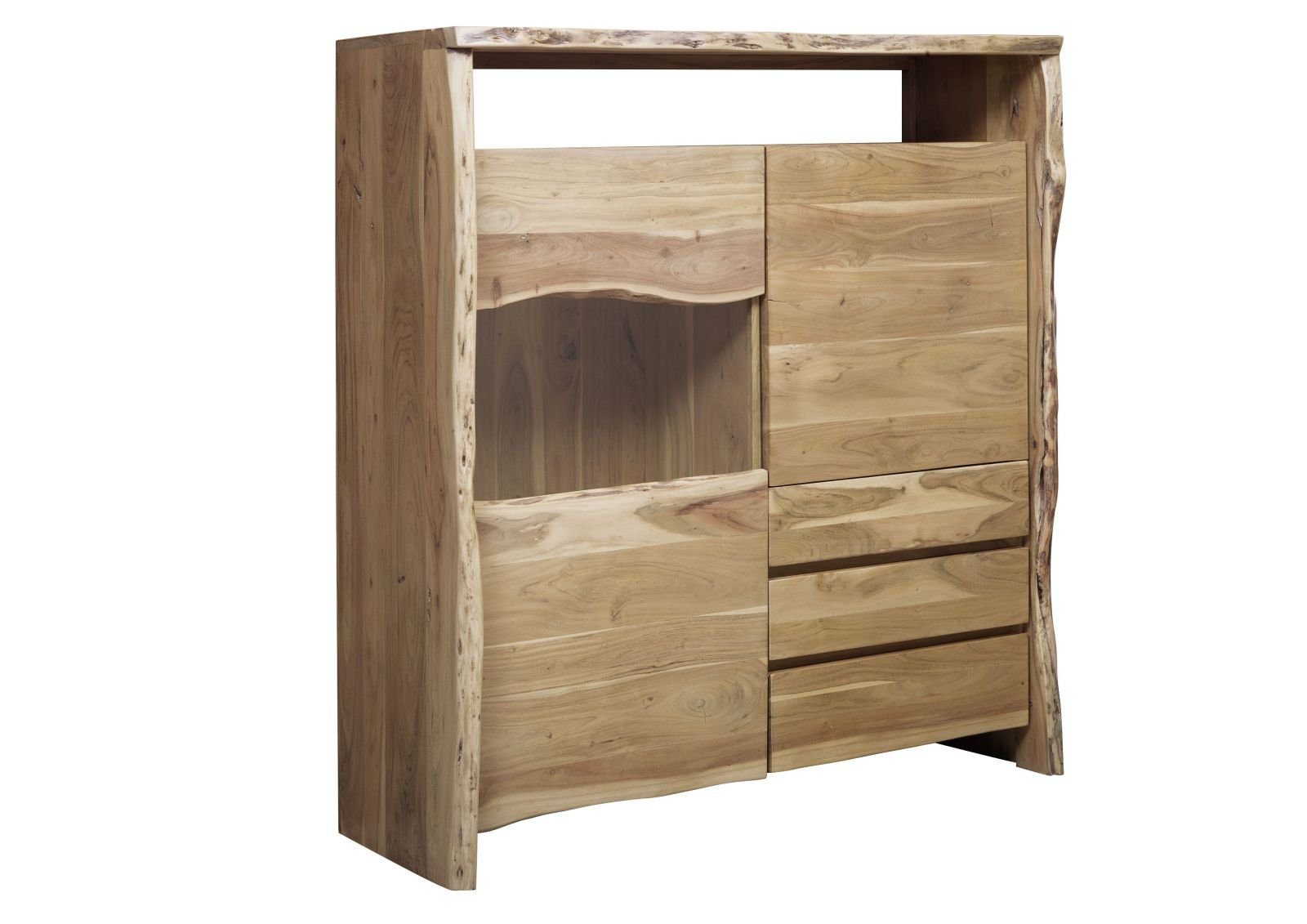 Elegant mit dem besonderen Etwas: Dieses moderne Highboard aus massivem Akazienholz bezaubert mit seiner individuellen Baumkanten-Optik. Das Stauraumwunder verfügt über drei Schubladen, ein offenes Fach sowie und fünf weitere Fächern hinter zwei Türen “ reichlich Platz also für all die großen und kleinen Habseligkeiten. Besonders charmant: Ein Teil der Tür ist verglast und gewährt so Einblicke in die besonderen Accessoires im Inneren des Schranks.