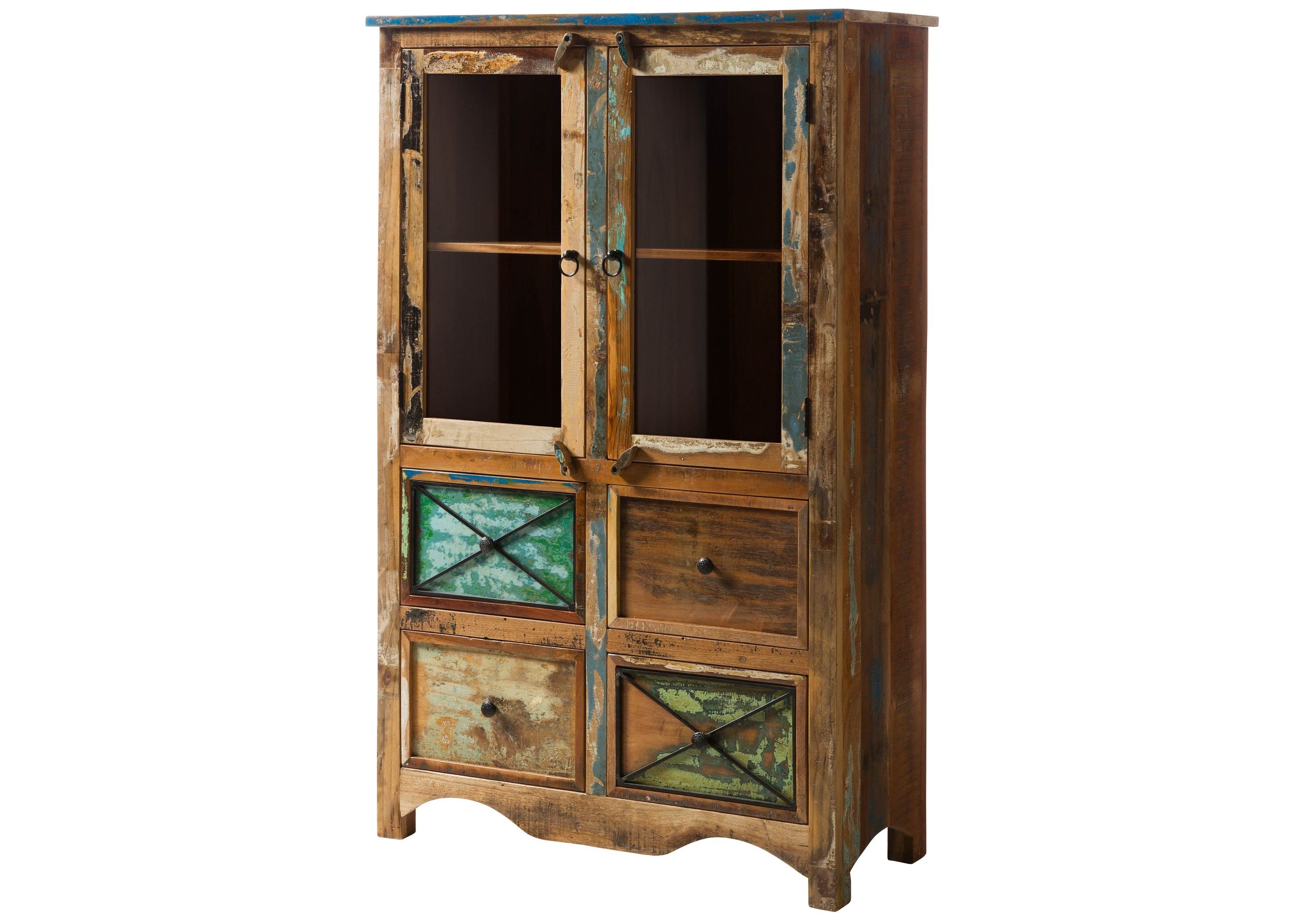 Mit einer außergewöhnlichen Optik und viel Stauraum kommt dieses Highboard daher. Die Vitrine im Vintage Style ist aus massivem Altholz, Mango und Akazie gefertigt. Individuelle Farbreste an Rahmen und Türen machen diese Kommode zu einem echten Blickfang in jedem Zuhause. In vier Schubladen mit gekreuzten Metallelementen und Knopfgriffen lassen sich Habseligkeiten kinderleicht verstauen. Besondere Schätze kommen in den offenen Fächern hinter den beiden Glastüren hervorragend zur Geltung.