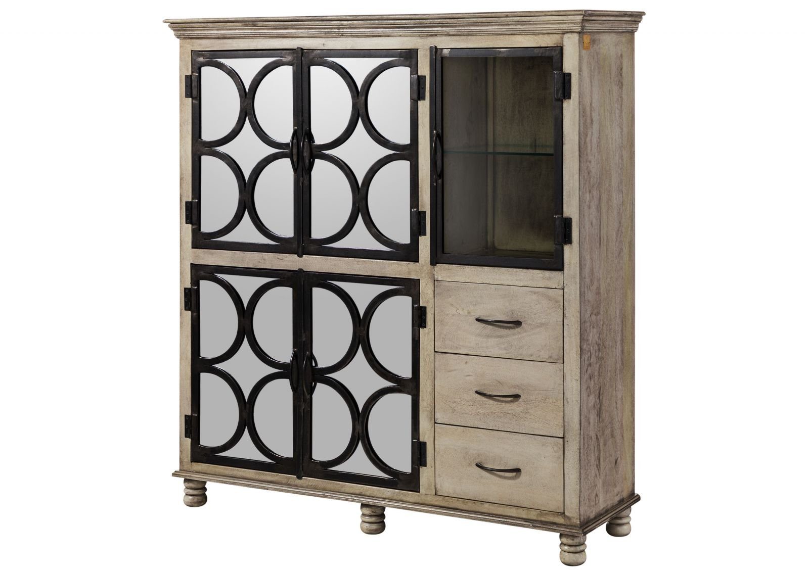 Hier wird der Stilmix zur Schau getragen: Dieses Highboard aus massivem Mangoholz, Eisen und Spiegelglas vereint verschiedene Vintage-Stilrichtungen. So zieht sich ein Eisendekor über verspiegelte Glastüren, dessen rundliche Formen an Art déco erinnern. Möbelkranz und gefräste Kugelfüße verbreiten zugleich den romantischen Eindruck des beliebten Landhausstils. Schönes Detail: Ein Vitrinenteil auf der rechten Seite bietet Gelegenheit, kleine Kunstwerke und Schmuckstücke stilgerecht zu präsentieren.