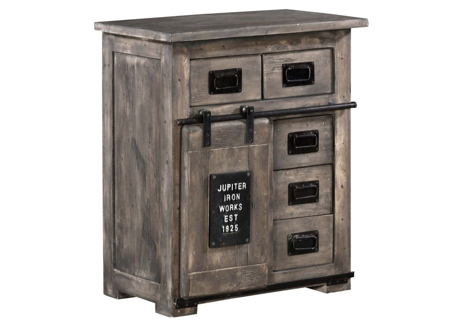 Ein weiteres optisches Highlight der Kommode im Industrial Style stellt die Schiebetür dar. An einer frontal montierten Eisenstange lässt sich diese verschieben. So werden wahlweise drei der fünf Schubladen des Möbels oder zwei großzügige offene Fächer verdeckt. Das detailreich gearbeitete Eisen-Element der Tür komplettiert die Optik und unterstreicht den besonderen Charakter dieser Kommode.