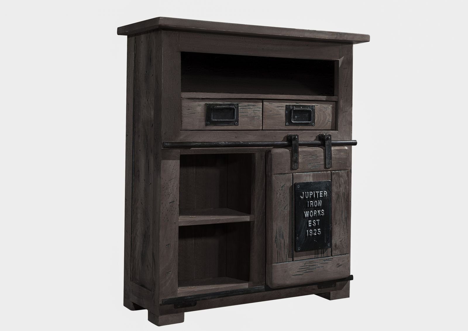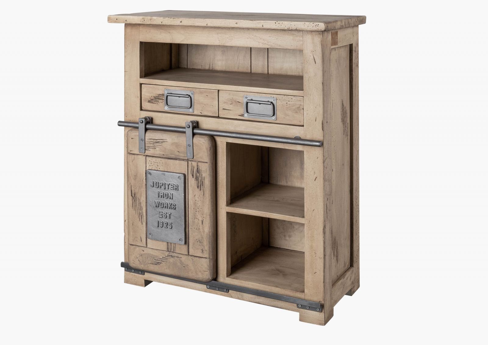 Stauraum auf zwei Ebenen: Industrielle Massivholz-Kommode Diese Kommode aus massivem Mangoholz will hoch hinaus. Denn das Möbelstück der RAILWAY Serie bietet so viel Stauraum, dass dieser auf zwei Ebenen aufgeteilt wurde. So finden sich im oberen Teil des Sideboards zwei geräumige Schubladen sowie eine großzügige Ablagefläche. In der unteren Hälfte verbergen sich vier offene Fächer. In dem Möbel findet also alles Platz, von den Familienfotos bis hin zur Zeitschriftensammlung. Einen besonderen Akzent setzt zudem die Kombination aus Massivholz und dunklen Eisenelementen. Diese finden sich vor allem an den beiden Schubladen, doch auch an einer Schiebetür.