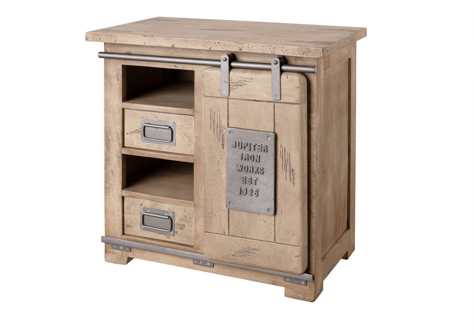 Nachträglich hinzugefügte wurmähnliche Löcher und Abnutzungsspuren machen diese Holzkommode der RAILWAY Kollektion zum Hingucker in der Wohnung. Das nachbearbeitete Holz des Mangobaums sieht nicht nur effektvoll aus, sondern passt auch gut zu den metallischen Elementen, welche sich im angesagten Industrial-Stil zeigen..