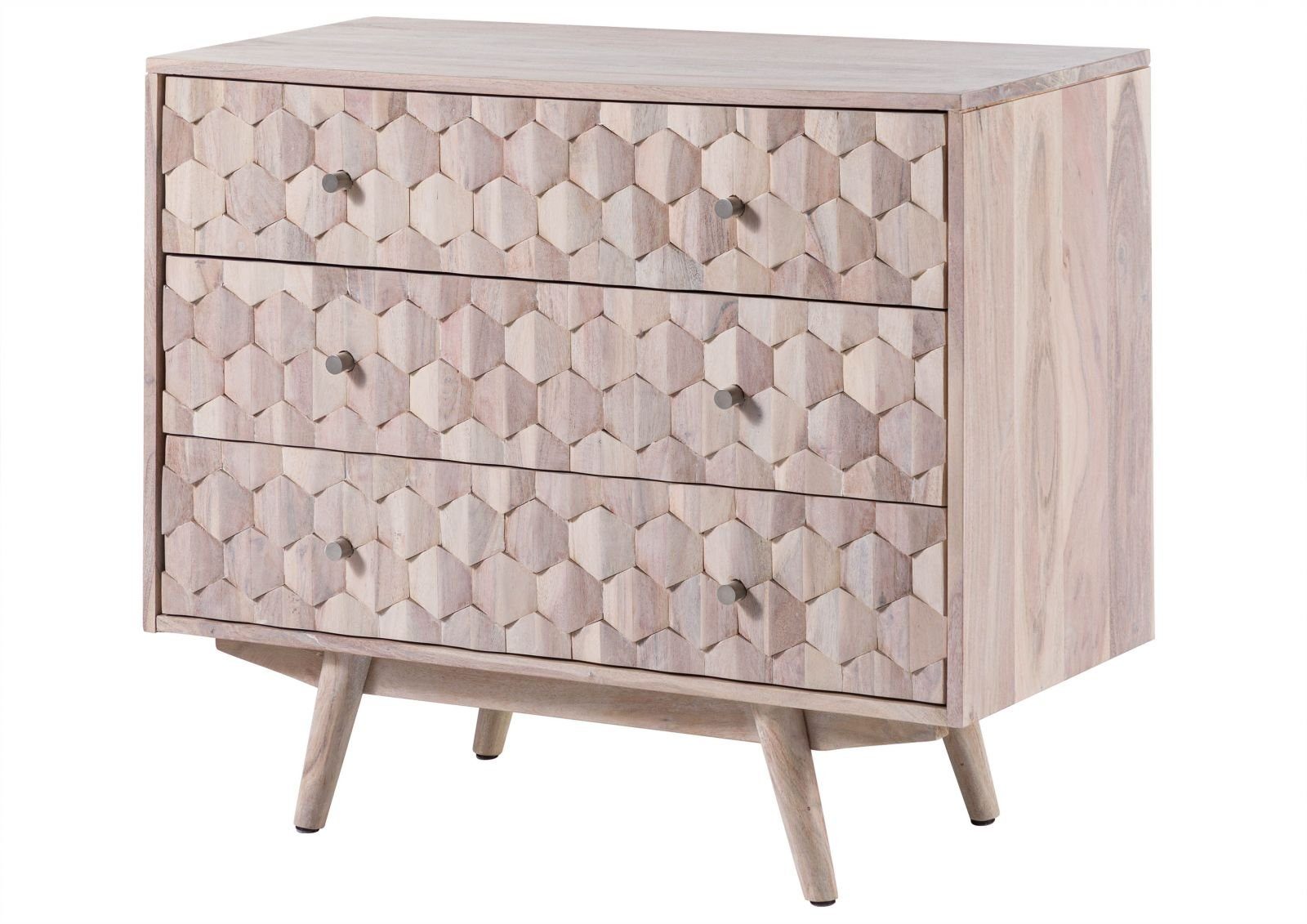 Die dreidimensionale, strukturierte Oberfläche der Schubladen und die schimmernde Lackierung verleihen dieser Kommode der MOSAYK Kollektion das gewisse Etwas. In Kombination erzielen die hochwertige Lackoberfläche und das handgearbeitete Mosaik-Muster eine atemberaubende Wirkung, die von der natürlichen Ausstrahlung des Akazienholzes komplettiert wird.