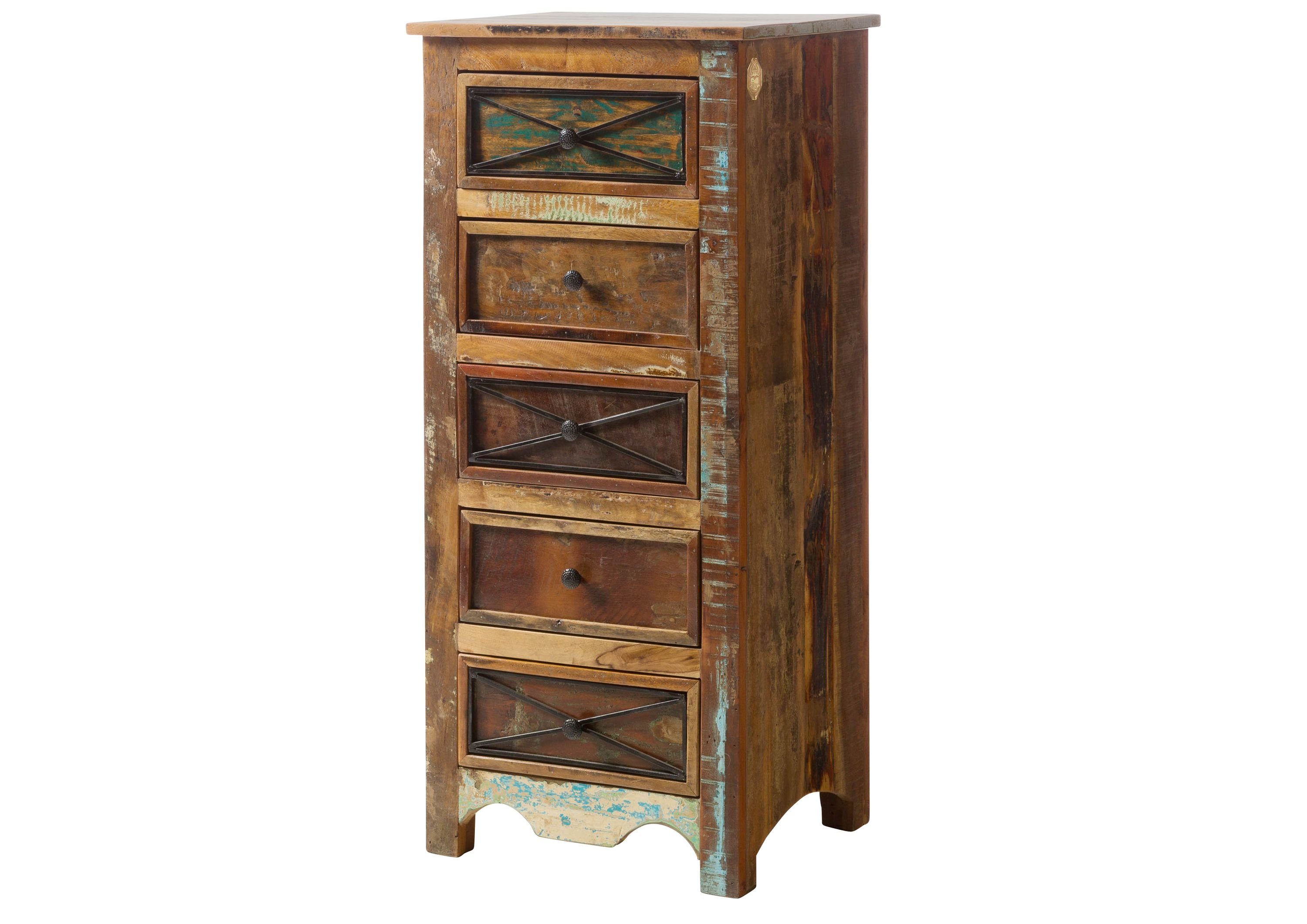 Diese Kommode feiert den Vintage-Lifestyle auf ganz besondere Art: Die farbenfrohen Fronten aus recyceltem Altholz erzählen mit bewusst erhaltenen Farbresten eine ganz eigene Geschichte. Dieser Shabby Chic spiegelt sich zugleich in den geschwungenen Sockel-Elementen und den kontrastierenden Zierleisten aus Metall wider. So glänzt das ausgefallene Möbelstück nicht nur mit Stauraum in fünf Schubladen, sondern setzt auch ein Statement für individuelles Wohnen mit Stil.