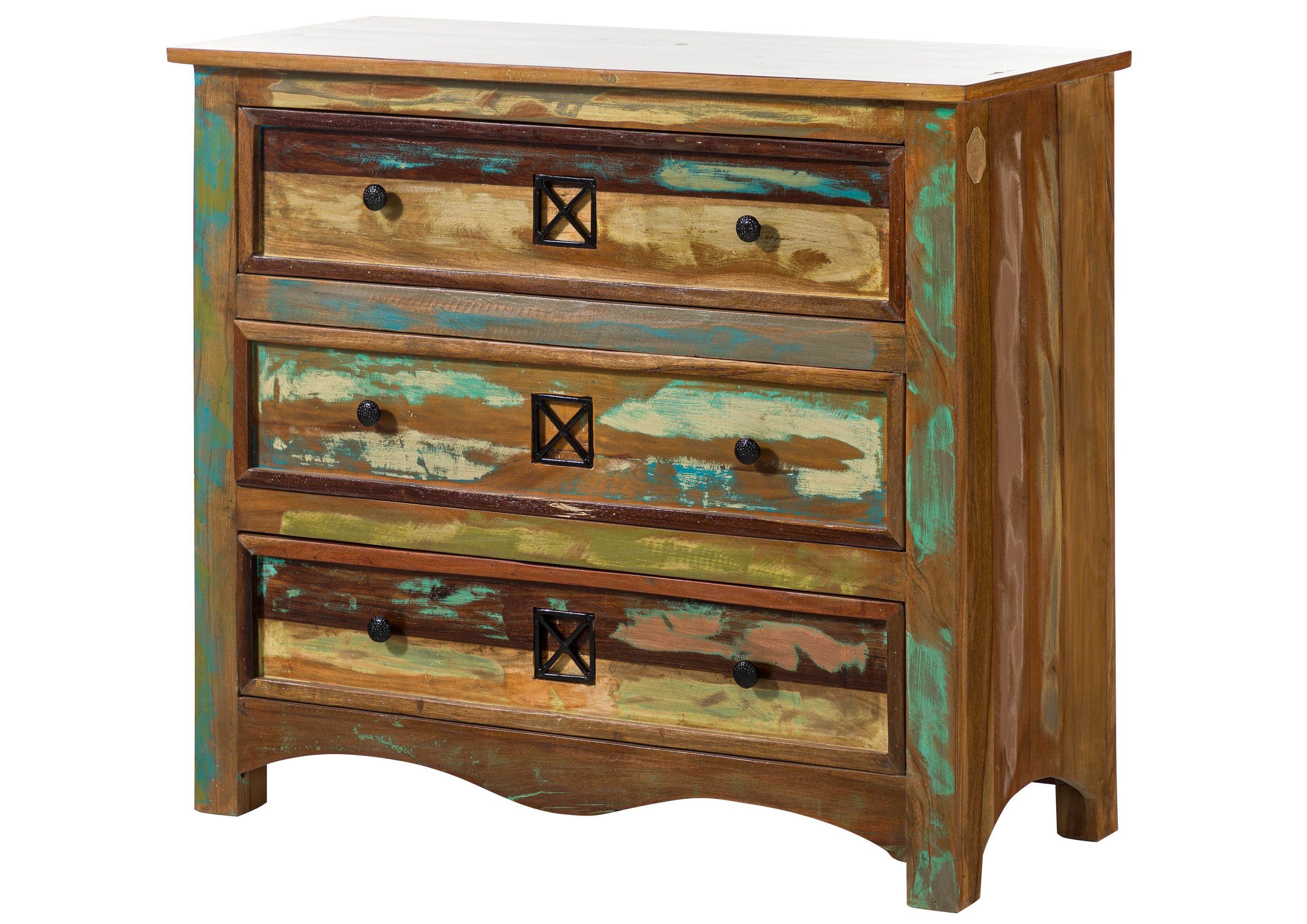 Charmante bunte Altholz Kommode im Vintage mit 3 Schubladen aus der Serie NATURE OF SPIRIT. Kaum ein Möbelstück bietet eine derartige Farbgestaltung in welcher sich diese Kommode zeigt. Mit dem verwendeten indischen Altholz, welches aus alten Schiffen und Brücke gewonnen wurde bietet sich neben dem besonderen Design auch eine exklusive Materialwahl dar.