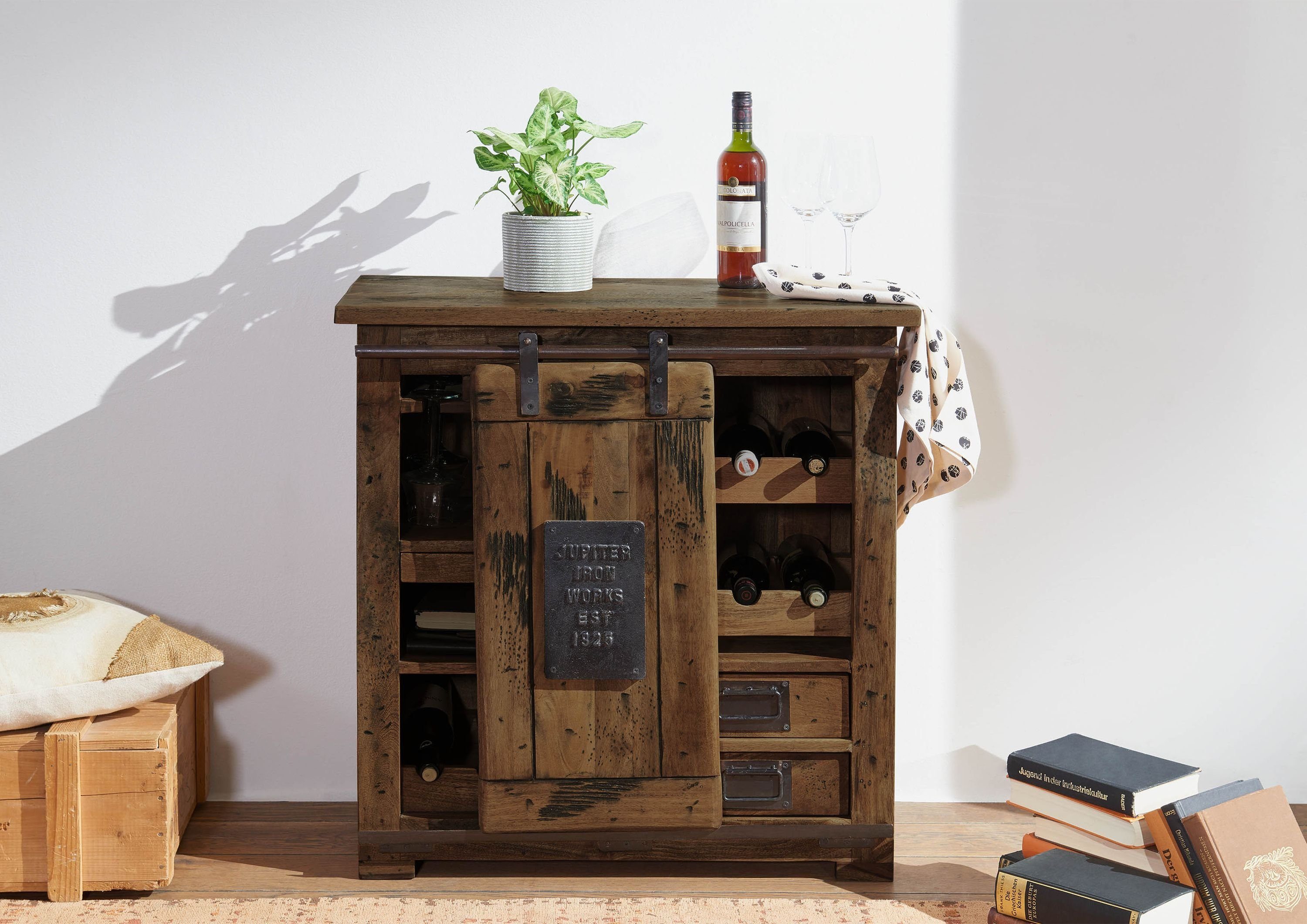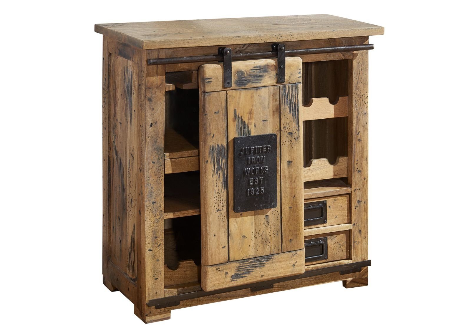 Im angesagten Industrial Stil zeigt sich diese vollmassive Weinkommode der Reihe RAILWAY. Das Möbelstück wurde aus Mango-Holz gearbeitet und begeistert mit Abnutzungsspuren, einer Schiebetür und metallischen Applikationen. Vor allem der Einteilung gebührt die Aufmerksamkeit. Im Inneren der Kommode befinden sich zahlreiche Weinfächer sowie integrierte Glashalter, in welchen Sie Ihre Weingläser über Kopf aufbewahren können.