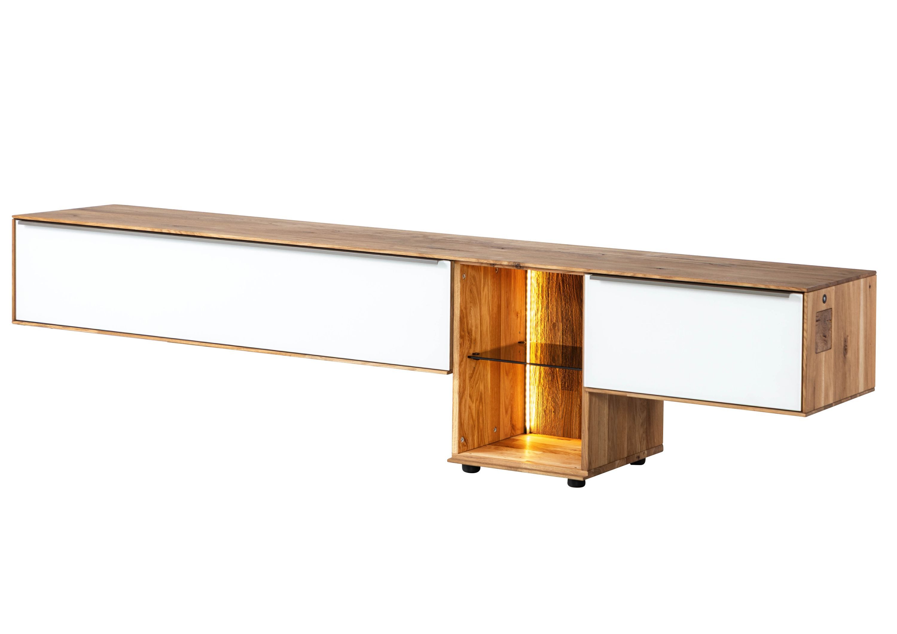 Edles Design, das in Erinnerung bleibt: Dieses Lowboard aus massiver Wildeiche verbindet Stauraum mit einem ausdrucksstarken Äußeren. Der sanft geölte Korpus präsentiert die lebendige Maserung. Als Rückwand mit sandgestrahlten Elementen kommt die einzigartige Holzstruktur spürbar zur Geltung – optimal beleuchtet von dimmbaren LEDs. Auch auf funktionaler Ebene ist das Lowboard durch und durch modern: Все Türen sind mit der bewährten Soft-Close-Mechanik ausgestattet.