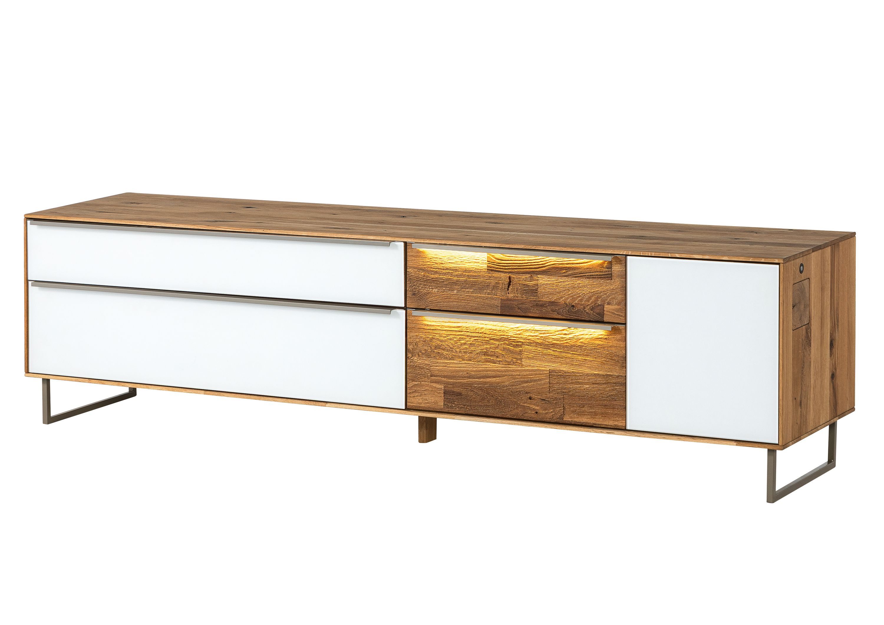 Ein erstklassiges Möbelstück für besondere Wohnumgebungen: Dieses Lowboard aus massiver Wildeiche setzt einen Akzent in jedem Raum. Vor allem das Front-Element aus sandgestrahltem Holz fällt ins Auge. Die individuelle Struktur wird von integrierten LEDs bestens in Szene gesetzt. Moderne Hingucker wie schwarze Griffleisten stehen im stilvollen Kontrast zur lebendigen Holzmaserung – und zeigen die Применитьkeiten des Designers Erik Quicker.