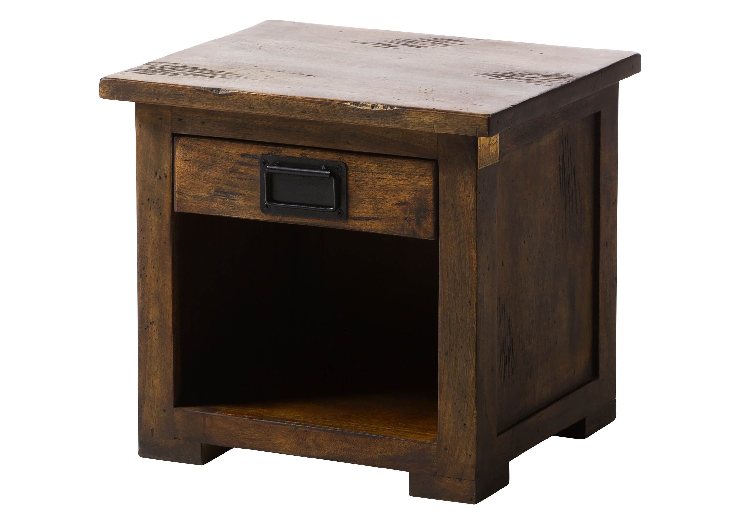 Dieser Nachttisch beweist, dass der Industrial Chic perfekt ins Schlafzimmer passt. Gefertigt aus hochwertigem Mango-Massivholz umgibt das kleine Möbelstück eine gemütliche und warme Ausstrahlung. Dazu kommt der schwarze Metallgriff der Nachttisch-Schublade, welcher einen stilvollen Kontrast mit nostalgischem Flair hinzufügt. Das offene Fach hält Bücher, Taschentücher oder weitere Alltagsgegenstände jederzeit griffbereit.