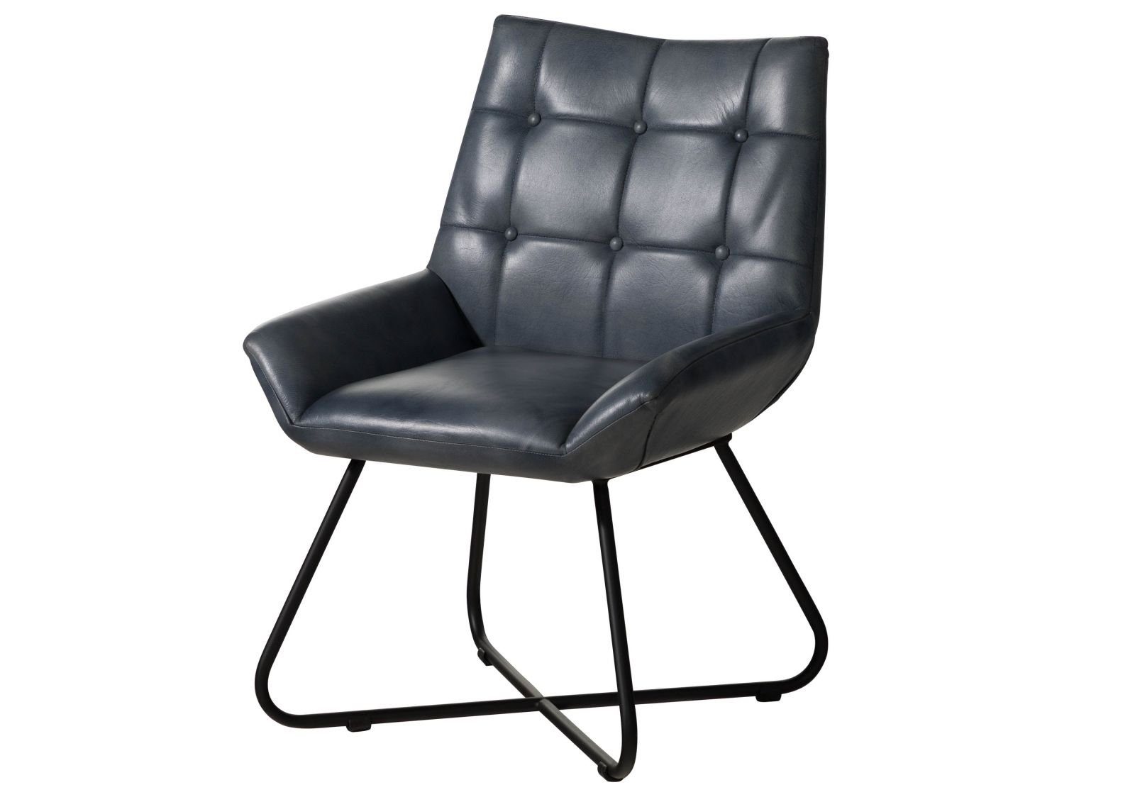 Dieser Lederstuhl in Blau ist mit hochwertigem Leder überzogen und überzeugt mit Details bis ins kleinste Detail. Raffinierte Steppungen und farblich abgestimmte Knöpfe zieren die Rückenlehne des Stuhls und das schwarze Kreuzgestell aus Eisen verleiht ihm einen stylischen Look. Entdecken Sie weitere Stühle der Serie IRON LABEL in unserem Shop.