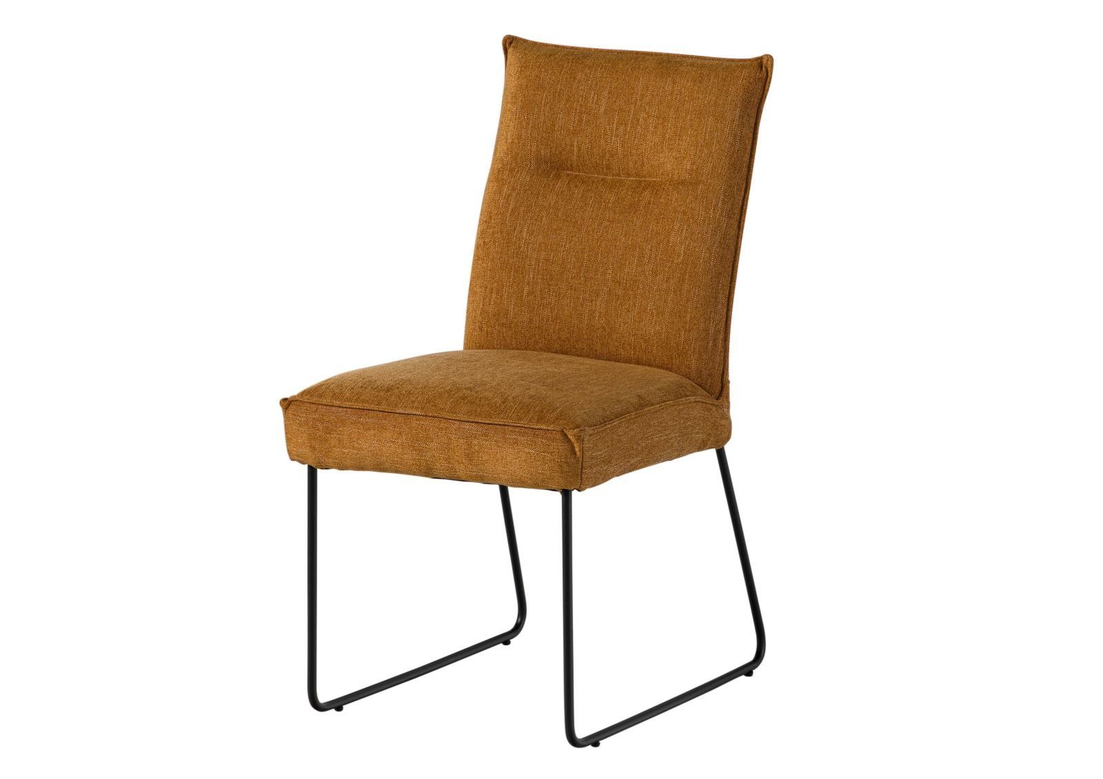 Für den perfekten Mix aus gemütlichem Komfort und filigranem Design sorgt dieser Polsterstuhl mit orangenem Stoffbezug. Hochwertig gearbeitete Kedernähte umspielen die Form des Sitzmöbels, während eine einzelne Steppnaht auf der Rückenlehne den dezenten Hingucker darstellt. In Kombination mit einem schwarzen Metallgestell wird dieser Stuhl zum stilvollen Allrounder.