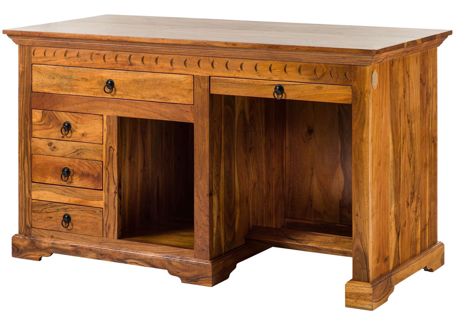 Der OXFORD Schreibtisch aus massivem, lackiertem Akazienholz überzeugt mit fünf Schubladen, offenem Fach und Tastaturauszug. Eingefräster Kranz, Profilleisten und detailreiche Schnitzarbeiten verleihen ihm eine elegante Ausstrahlung. Die lackierte Oberfläche betont die Maserung – ein stilvoller Arbeitsplatz mit klassischem Charakter.