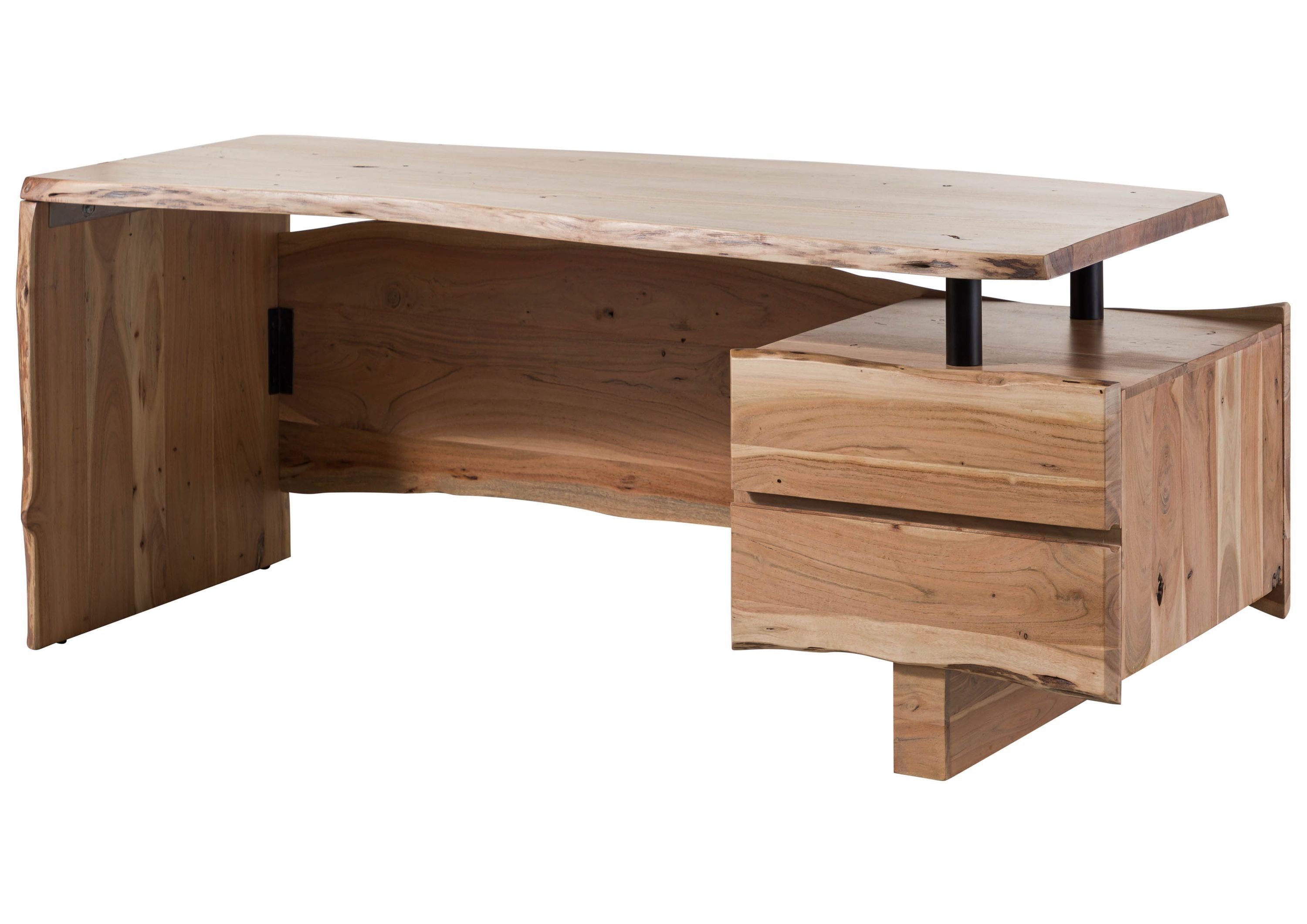Dieser Schreibtisch der Serie PURE ACACIA überzeugt mit rustikalem Baumkantendesign: Die Silhouetten der Rückwand, Seitenteile, Tischplatte sowie der Schubladenfronten folgen dem natürlichen Wuchs des Baumes. Signifikante Astansätze vervollständigen das markante Bild und geben dem Naturholz-Schreibtisch seine besondere Ausstrahlung. Das designorientierte Highlight stellt das scheinbar schwebende Schubladelement dar – ein ausdrucksstarker Akazie-Schreibtisch für das moderne Arbeitszimmer.