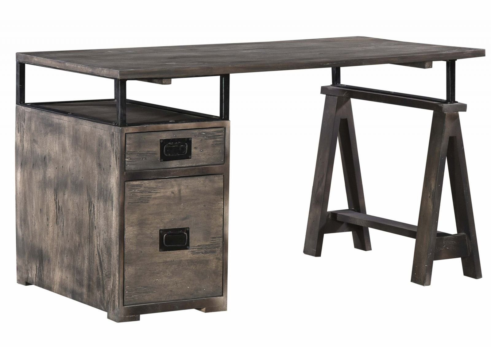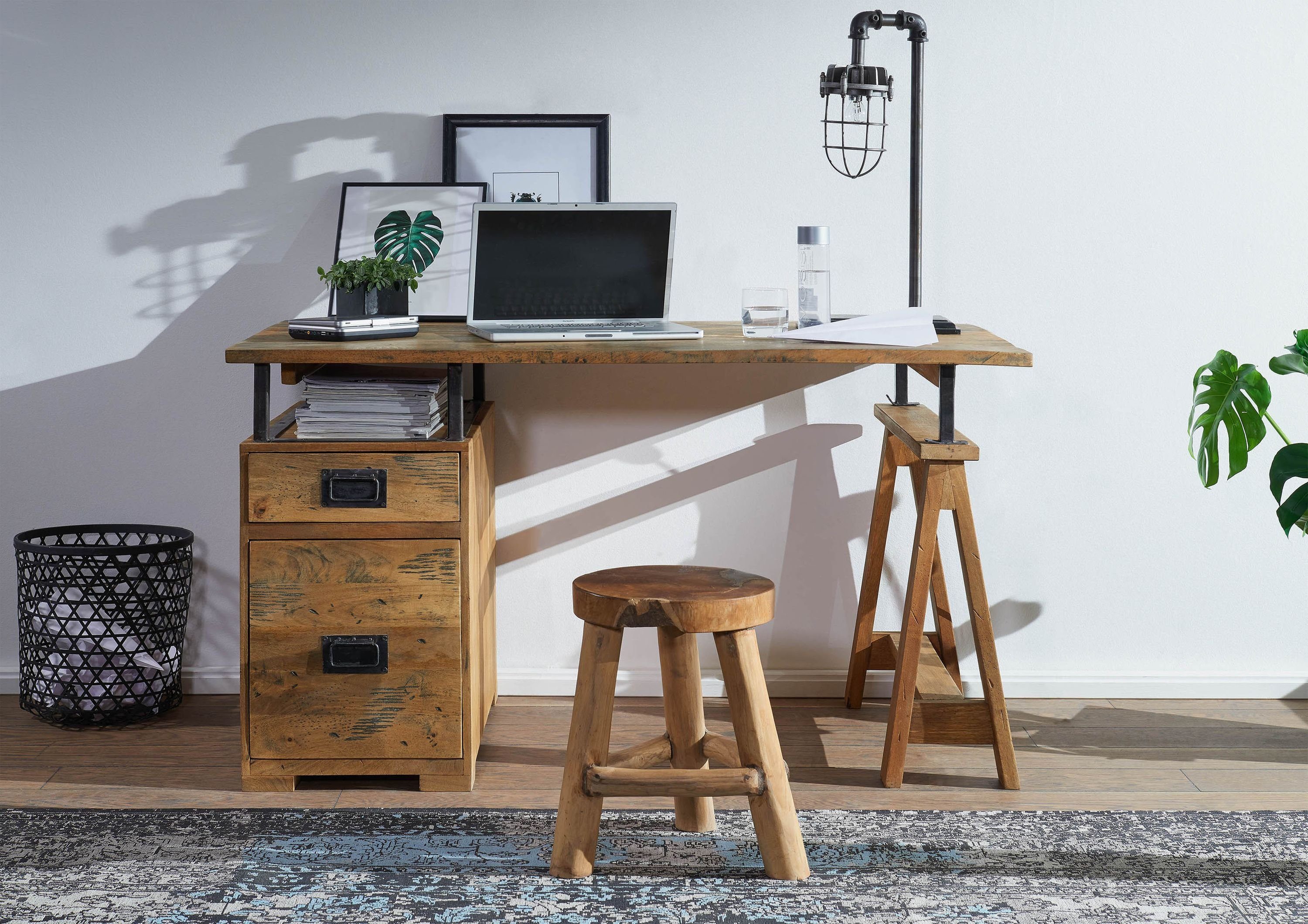 Dieser extravagante Schreibtisch der Reihe RAILWAY begeistert mit seinem beeindruckenden Holzbild und dem interessanten Gestell. Während sich auf der einen Seite ein Container befindet, reiht sich auf der anderen Seite ein Schreibtisch-Bock an. Die rustikale Platte aus Mango-Hartholz wird von Eisenträgern in die Höhe gestemmt, wodurch der Schreibtisch im Industrial Stil einen rustikalen Look erhält.