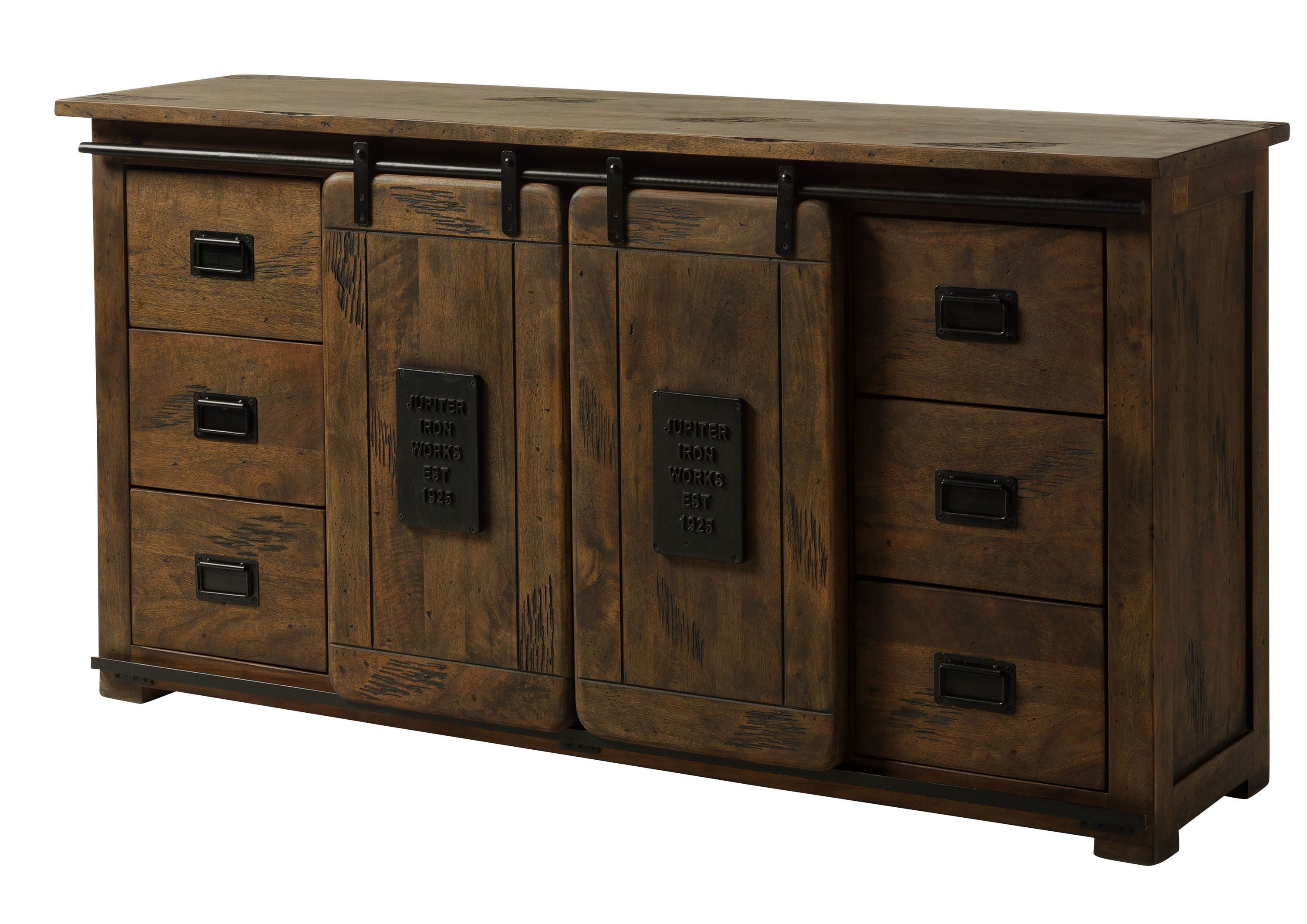 Angesagter Used-Look auf hochwertigem Mango-Vollholz: Das Sideboard der Wohnserie RAILWAY im Industrial Design verbreitet Fabrik-Flair in jedem Wohnraum. Während die Holzoberfläche durch Hobelschläge und dunkle Beize auf alt getrimmt wurde, ziehen insbesondere die Schiebetüren die Blicke auf sich: Durch eine Schiene aus Metall lassen sie sich über die gesamte Front verschieben. Durch acht Schubfächer und zwei breite Regalfächer wird die Kommode indes zum wahren Stauraumwunder.
