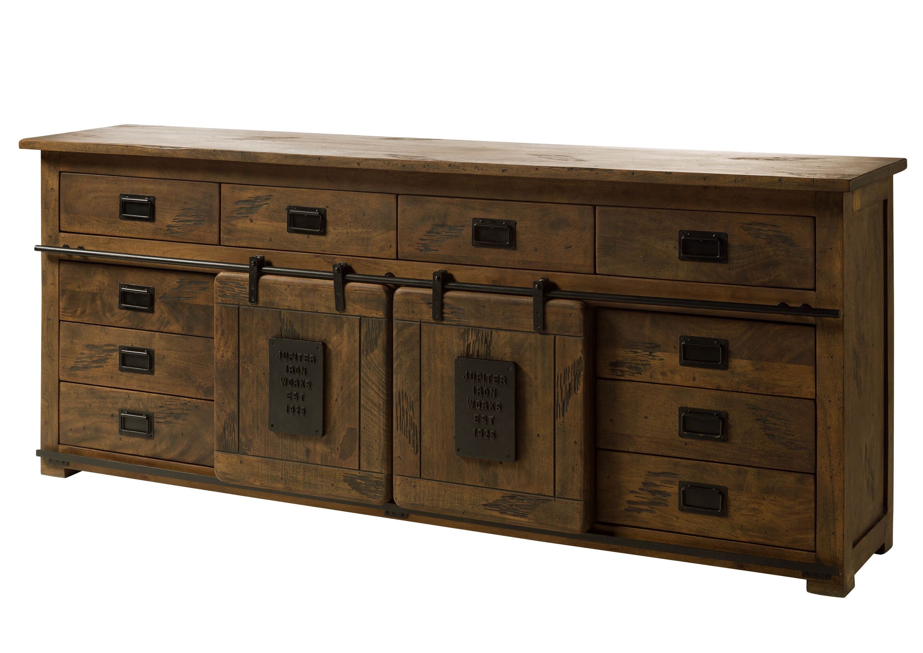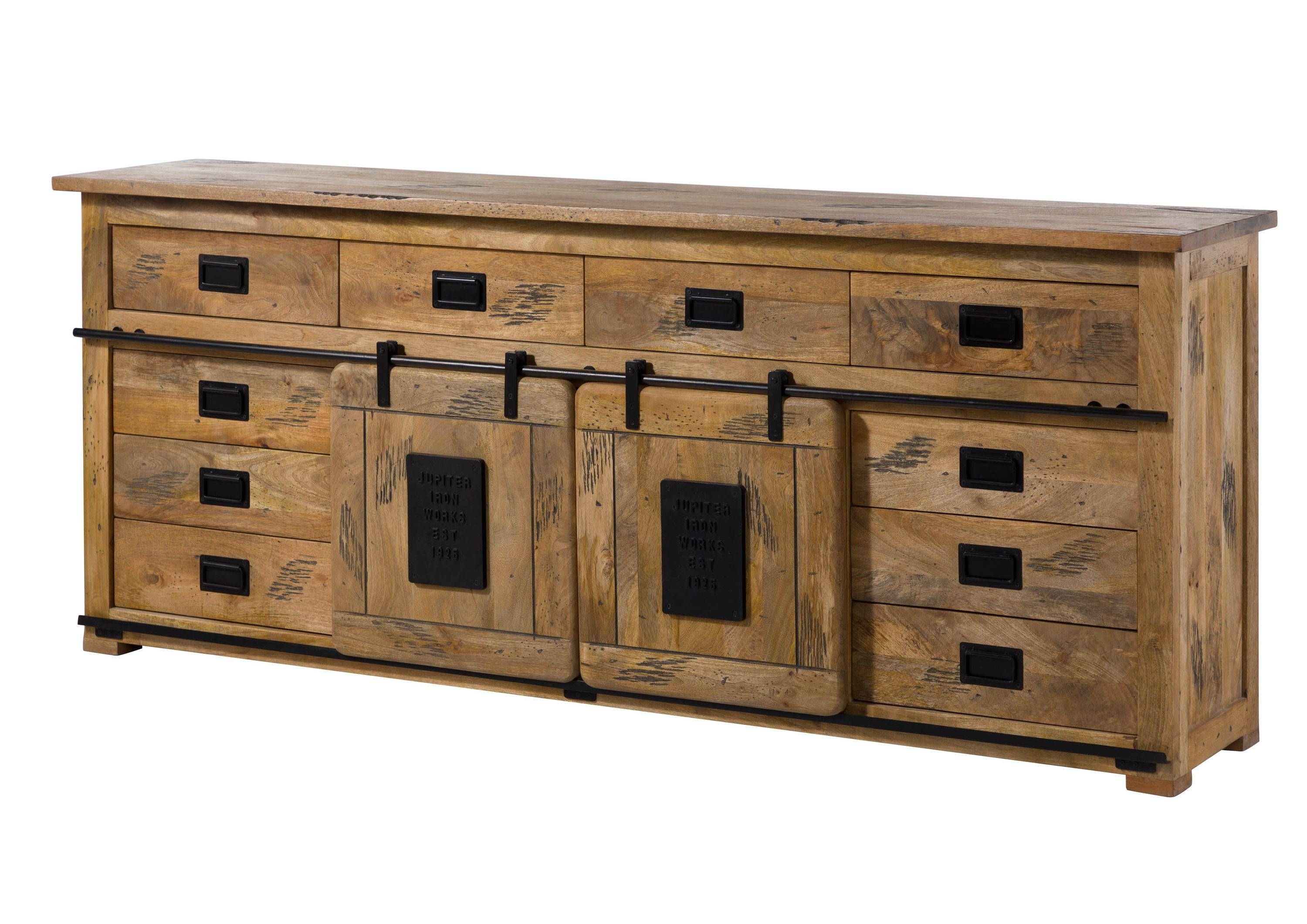 Das Highlight: Der Materialmix aus massivem Holz und dunklem Metall verkörpert den angesagten Factory-Look. Denn eiserne Beschläge, Griffe, Stangen und Scharniere kontrastieren das Naturmaterial, das durch die abwechslungsreiche Maserung und die nachträglich hinzugefügten Kerben und Kratzer absolut unique ist.
