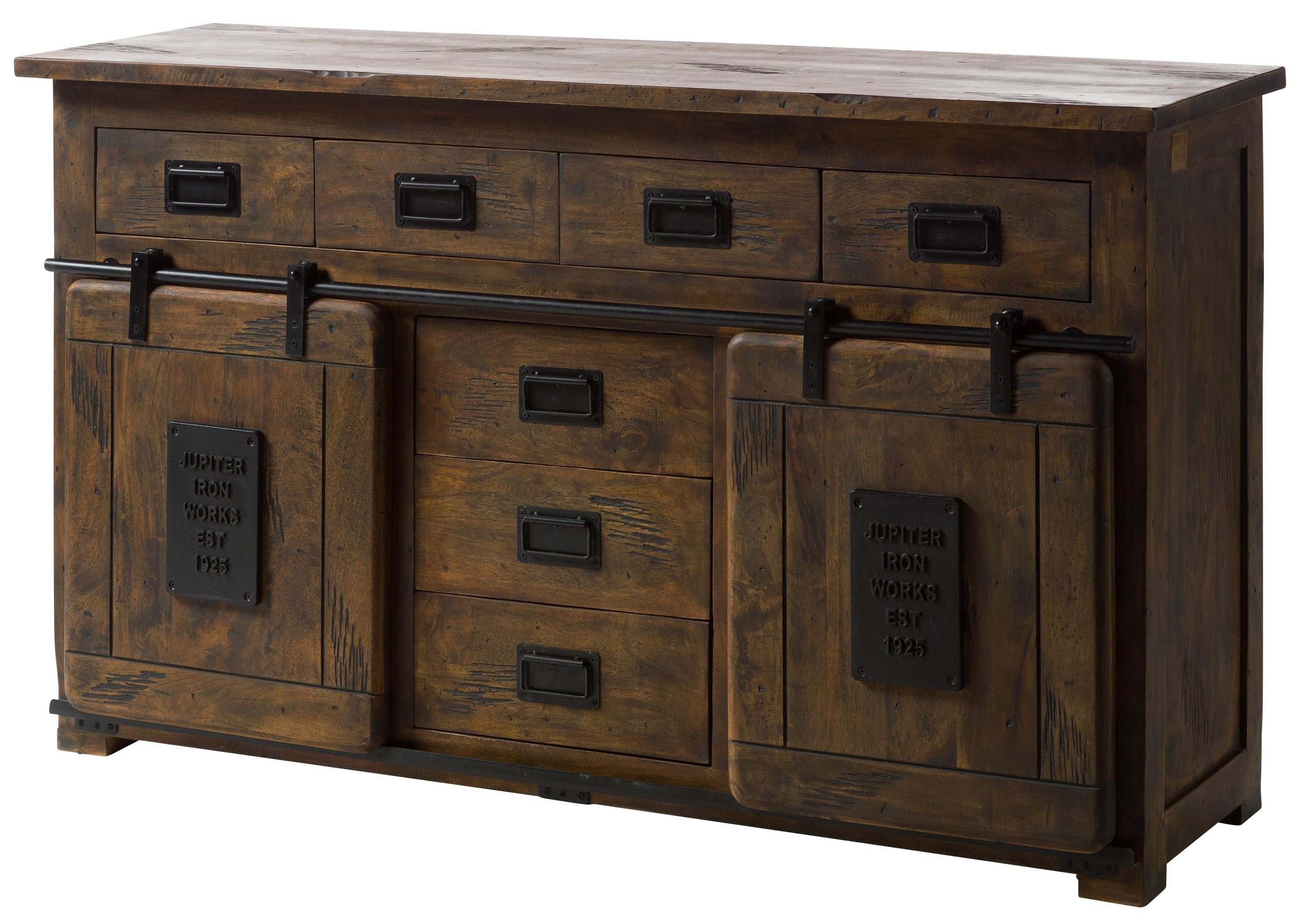 Das Sideboard überzeugt jedoch auch durch seinen industriellen Stil. Das massive Mangoholz und die dunklen Eisendetails sind dabei perfekt aufeinander abgestimmt. Durch Nachbearbeitung erhält das Holz seinen Used-Look, der durch Eisenelemente an Schubladen und Schiebetüren ergänzt wird. So avanciert die Massivholz-Kommode zu einem echten Allround-Talent im Industrial-Stil “ für Esszimmer, Flur oder Wohnbereich.