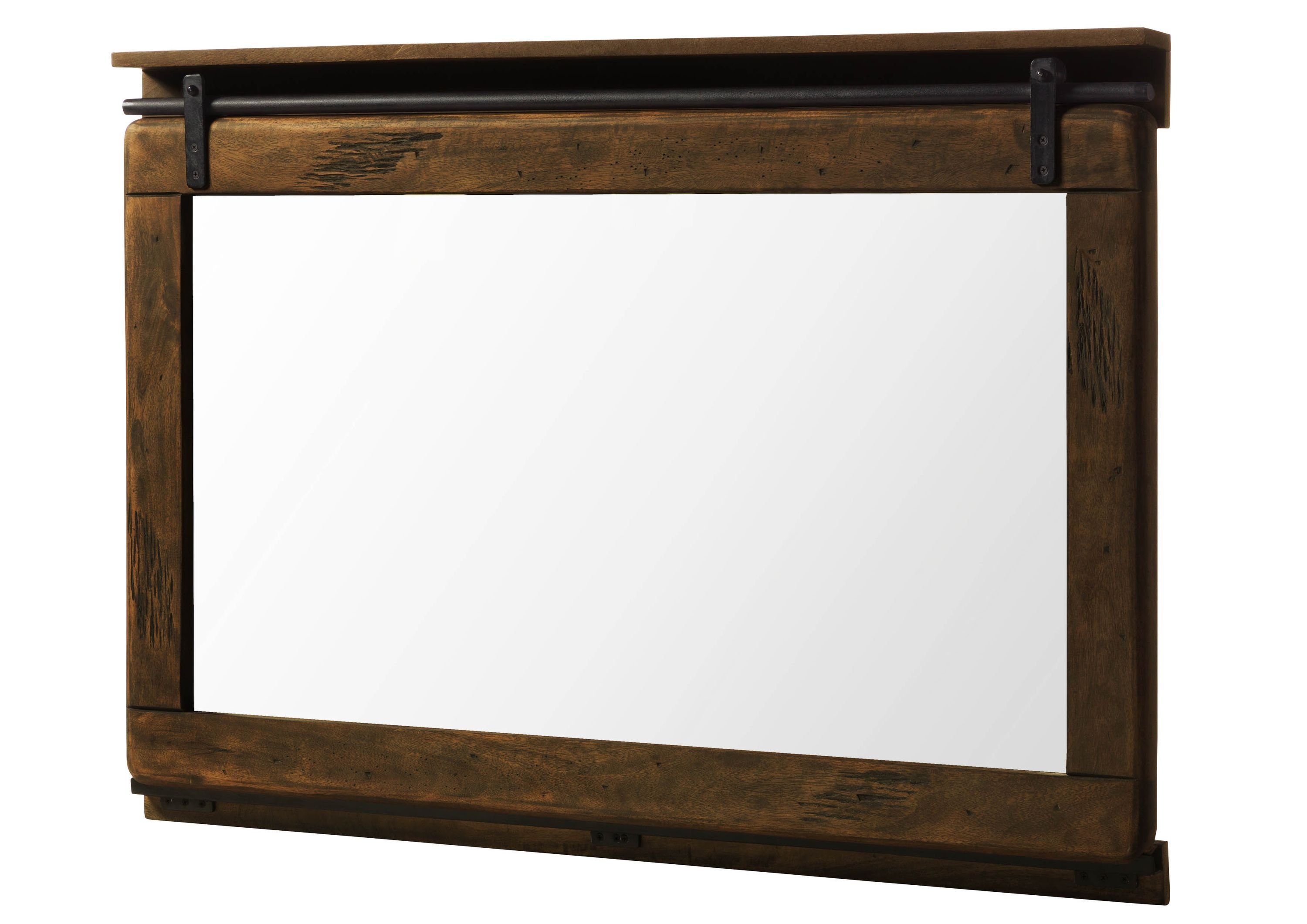 Die Konstruktion des Rahmens und die Bearbeitung der massiven Mango folgt dem industriellen Style: Zwei Holzleisten an den kurzen Kanten heben den Spiegel ein wenig von der Wand ab und verleihen der Silhouette eine weitere Ebene. Ein grober Hobelschlag verleiht der Oberfläche eine aufregende Struktur im Used-Look, während Fräskanten die Linienführung des Rahmens verlängern.