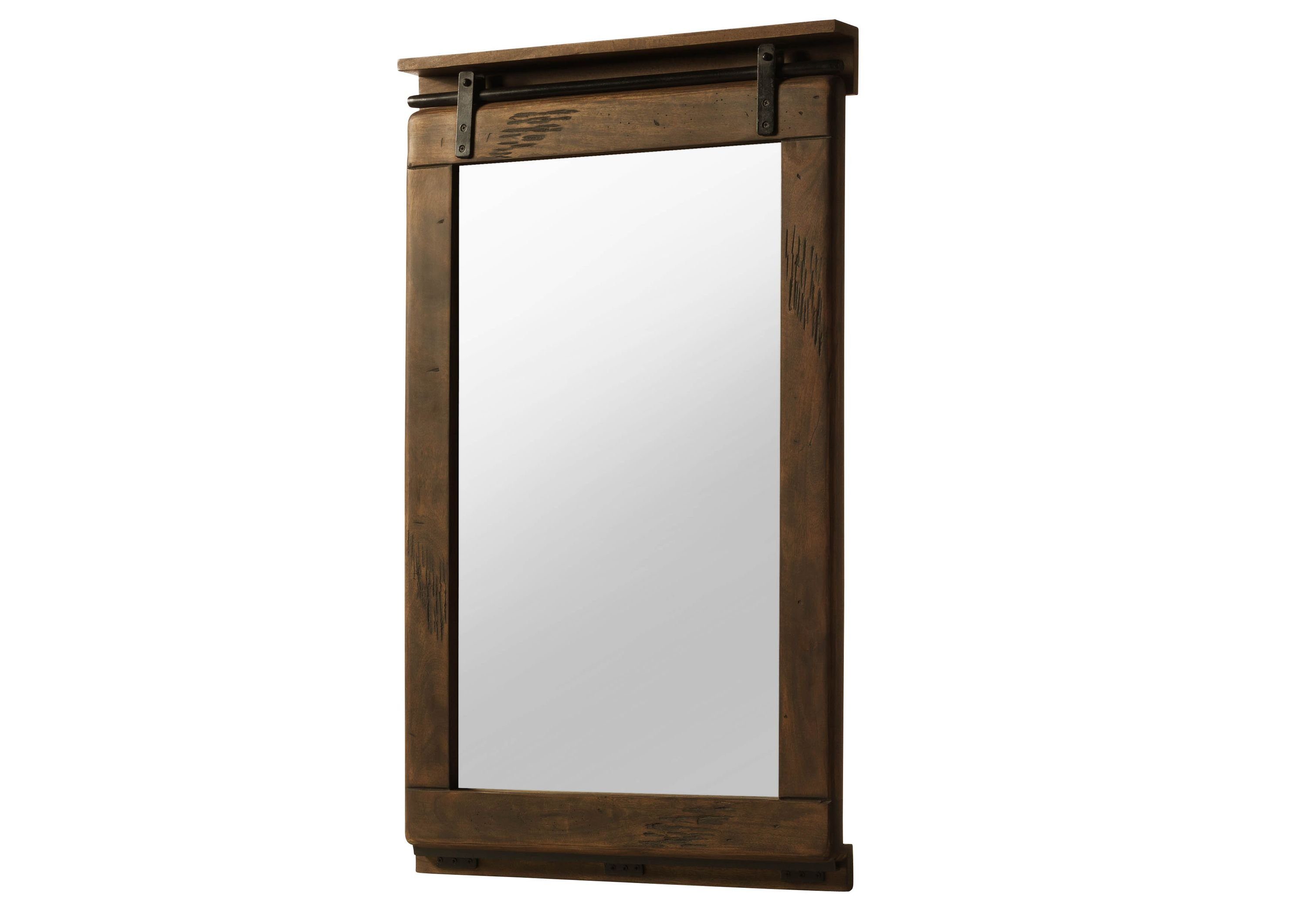 Die Konstruktion des Rahmens und die Bearbeitung der massiven Mango folgt dem industriellen Style: Zwei Holzleisten an den kurzen Kanten heben den Spiegel ein wenig von der Wand ab und verleihen der Silhouette eine weitere Ebene. Ein grober Hobelschlag verleiht der Oberfläche eine aufregende Struktur im Used-Look, während Fräskanten die Linienführung des Rahmens verlängern.