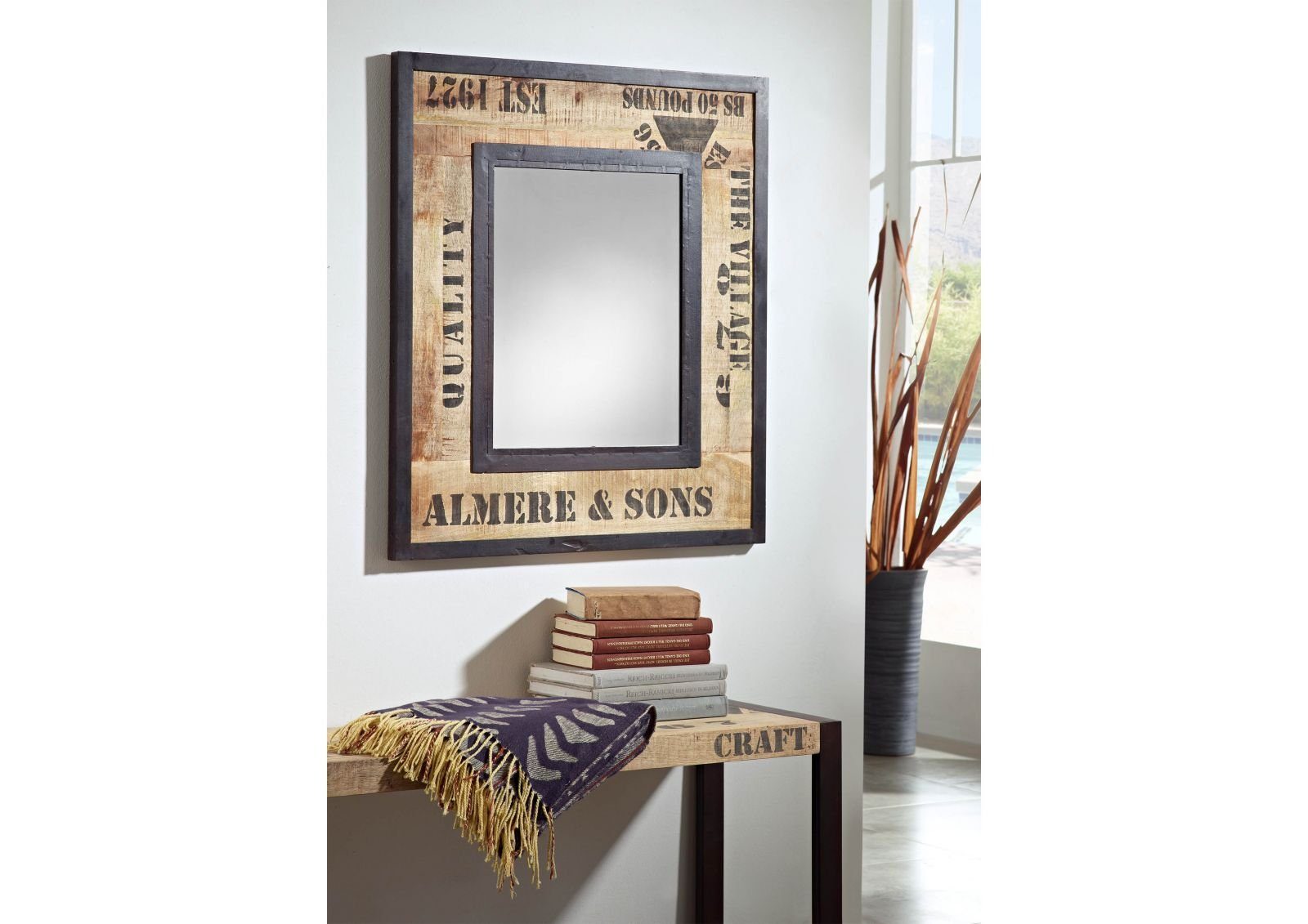 Bedruckter Mangoholz Spiegel im Industrial-Stil der Serie Factory aus Mangoholz und Eisen.Dieser Spiegel stellt wahrlich ein auffallendes Objekt dar. Der breite Holzrahmen, vollmassiv aus demHolz des Mangobaums gefertigt, stellt ein reines Naturprodukt dar.