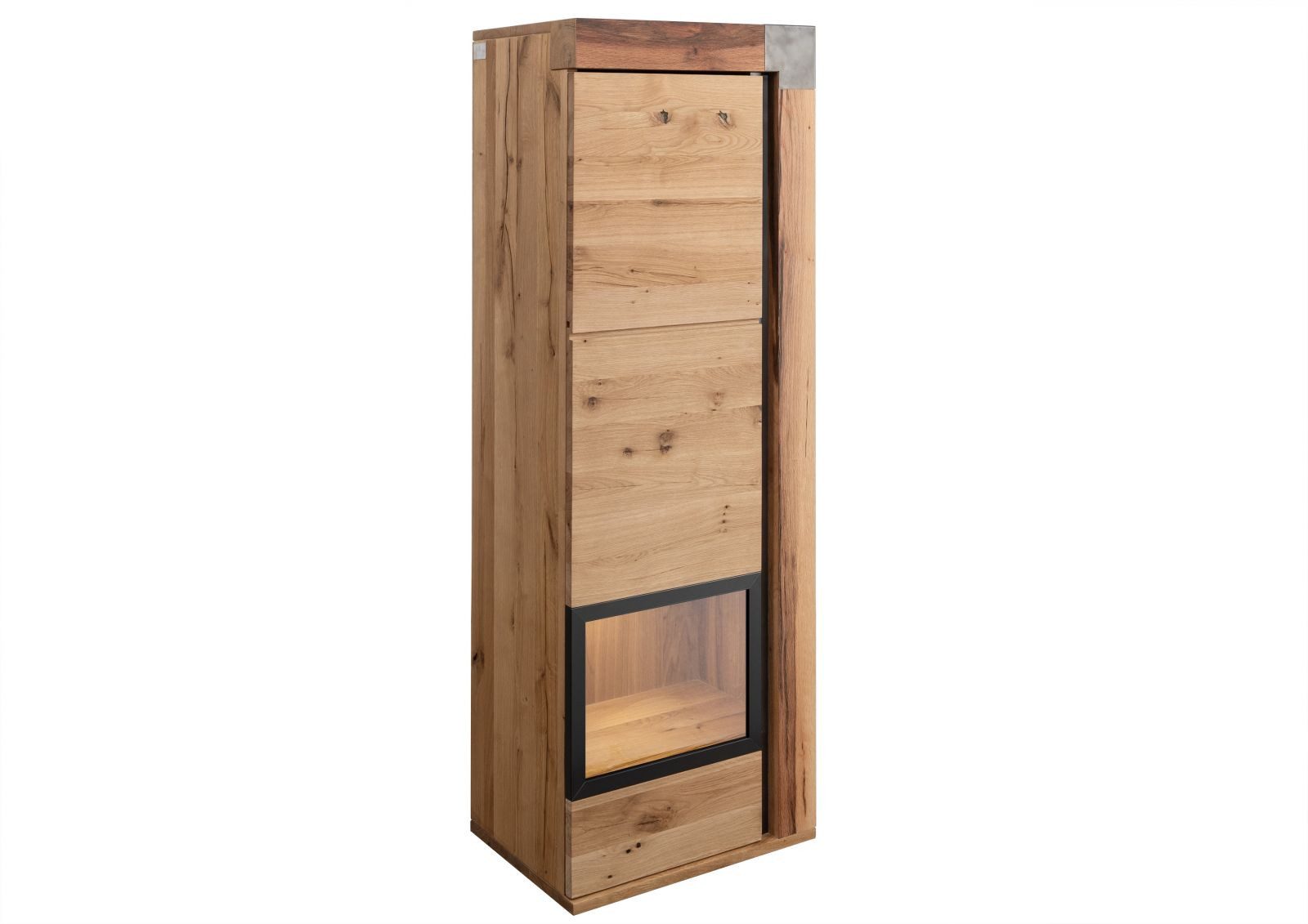 Dabei bleibt es naturbetont: Designer Erik Quicker lässt durch den edlen, getäfelten Look die Front aus Zerr- und Wildeiche für sich sprechen. Industrielle Akzente setzen der massive Balken, der die Silhouette rahmt, und das Metallelement in der oberen Ecke. Ein Glaseinsatz im unteren Drittel rundet das geradlinige Design optisch ab.