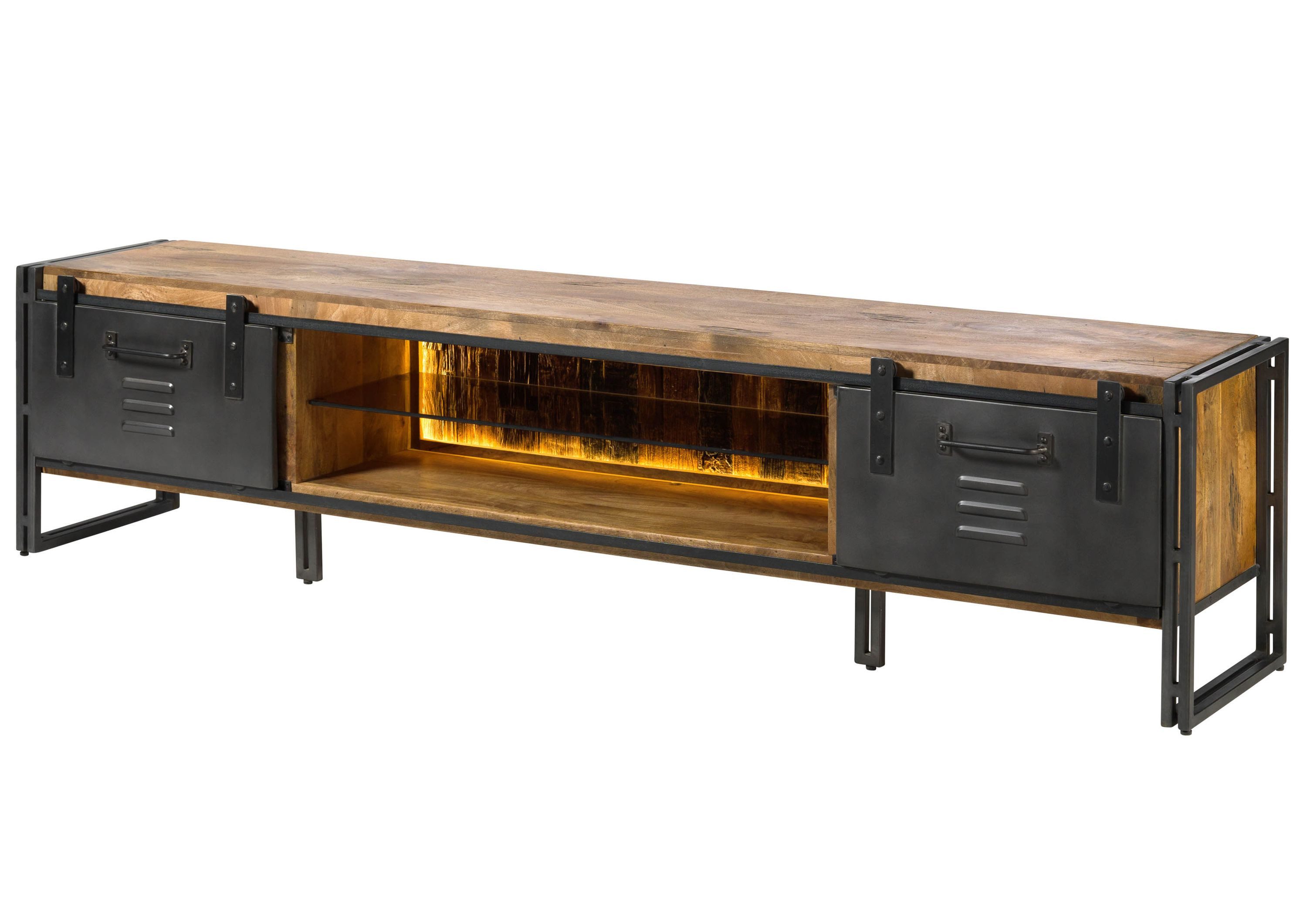 Dank integrierter LED-Beleuchtung erhält dieses TV-Board eine einladende Tiefe: Der offene Bereich in der Mitte ist mit Glasboden und einer strukturierten Rückwand aus Altholz ausgestattet. Sanfte Akzente schafft der zarte Lichtschimmer der eingebauten LEDs. Für starkes Industrial Design stehen hingegen die Schiebetüren in Spind-Optik sowie die rustikal bearbeitete Holzoberfläche mit sichtbarem Hobelschlag.